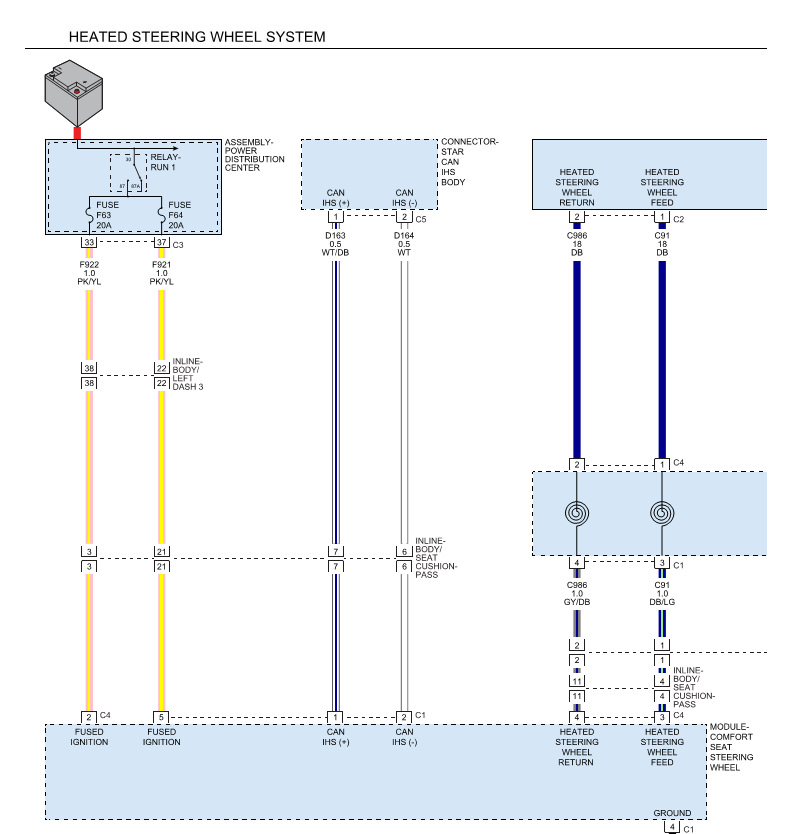 1)от руля нам необходимо положить два провода сечением не менее 1квадрата(как на схеме) к пассажирской сидушке