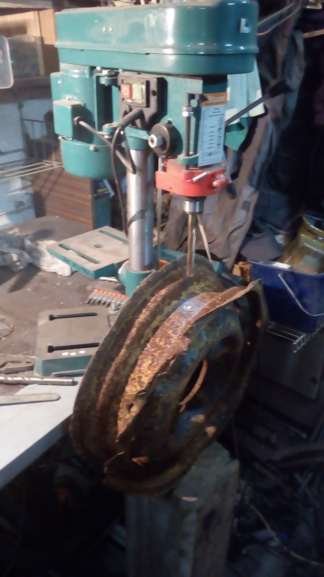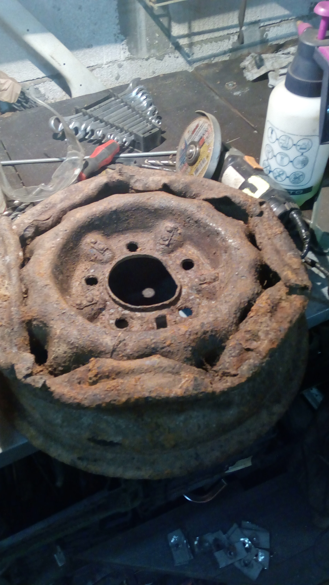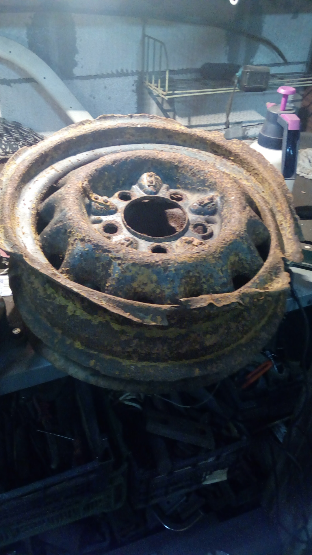 Поскольку предстоит длительная кузовщина, надо выставить раму относительно пола правильно, да и по крыльям важна геометрия, вначале занялся правильными дисками. Долго не решался на эту процедуру, но хороших дисков все меньше, а лесные как правильно уже уставшие. Причём чаще больше страдает обод, наверно потому что долго лежит в сырой земле с резиной, а влага не сохнет между ними.