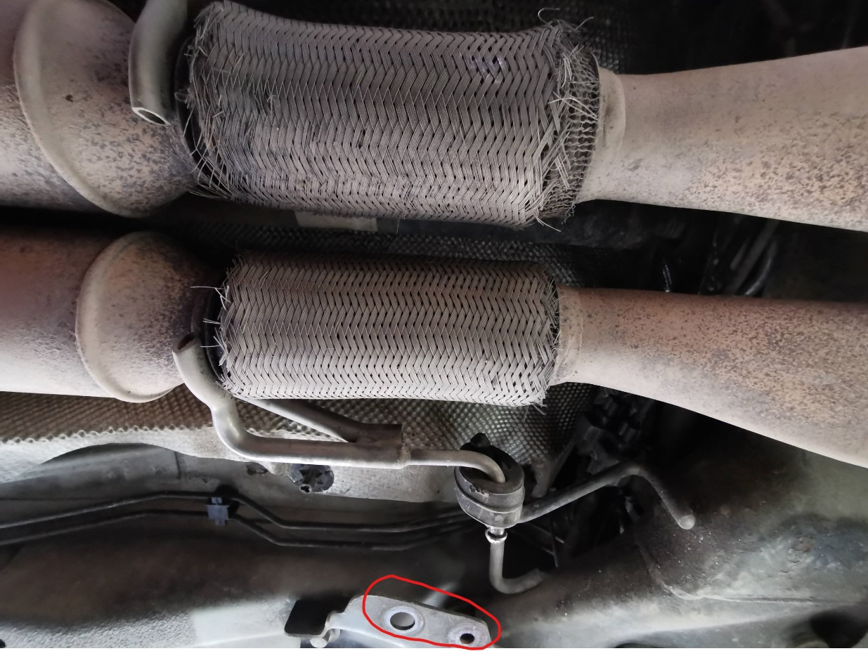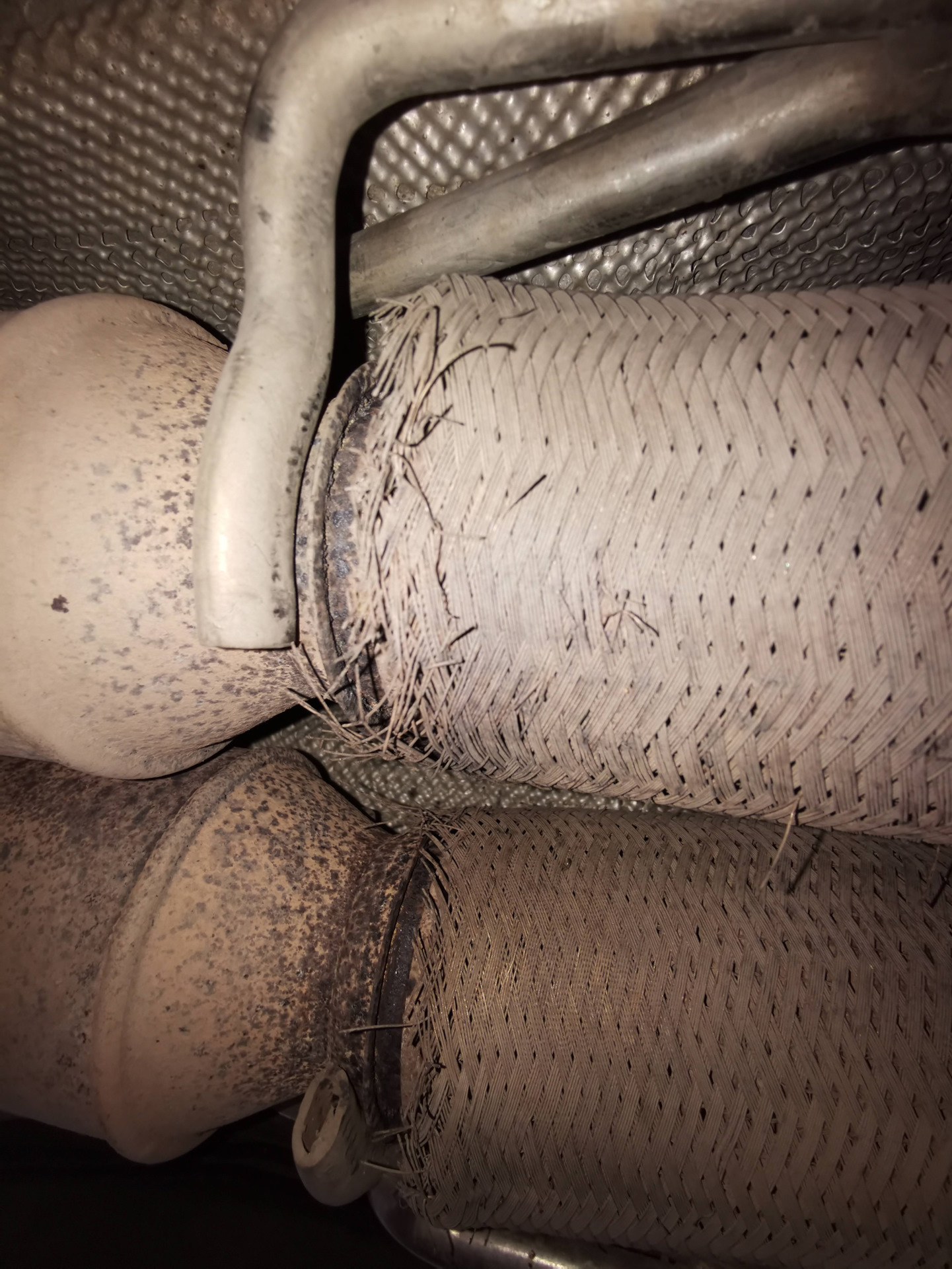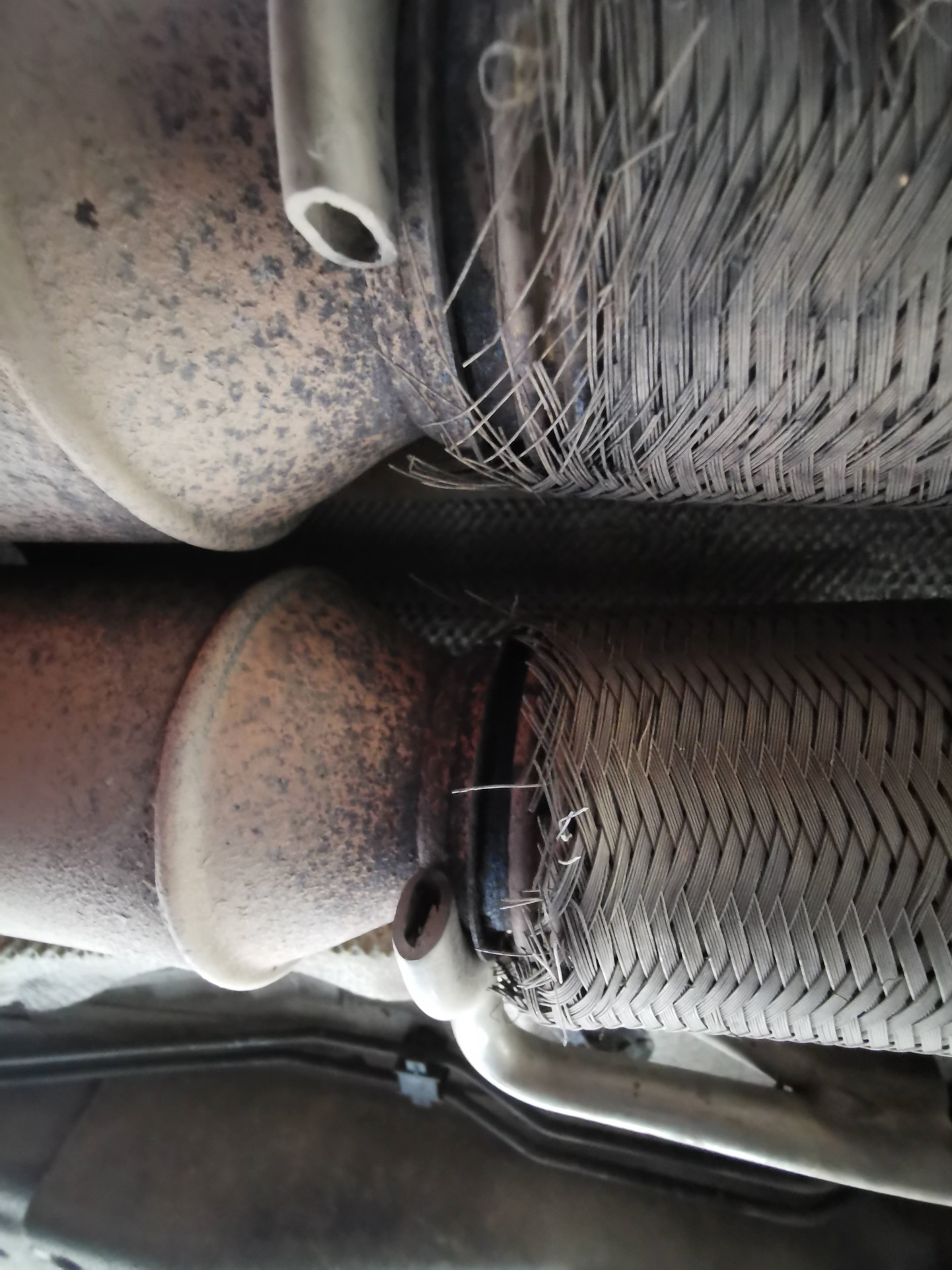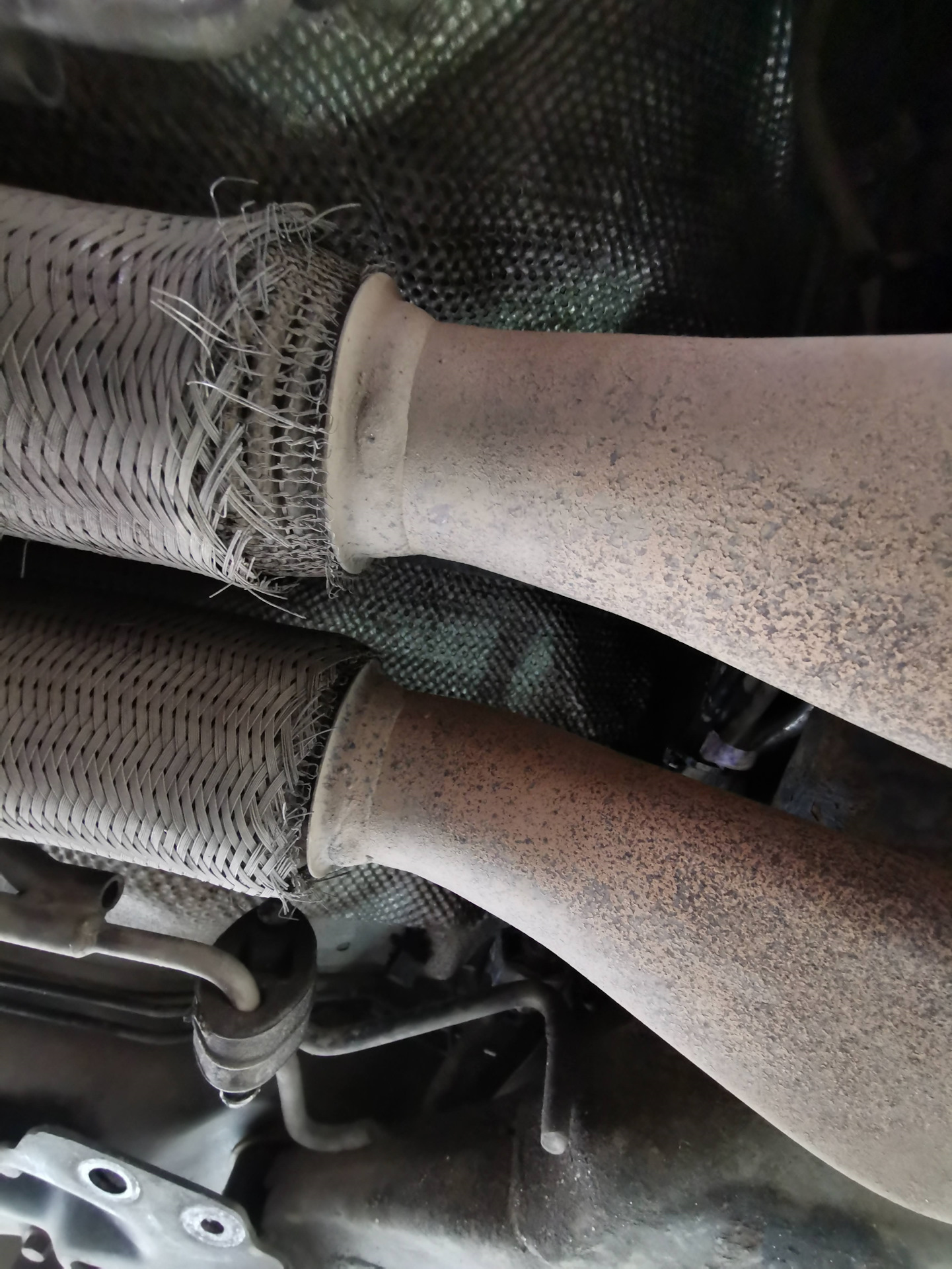2. Получается что из-за того, что гофры "подустали", т.е. стали более гибкими, то весь тракт просел и стал очень близко к поперечине, тем самым при большом газе весь выхлопной тракт прогибался еще ниже и касался поперечины, что вызывало собственно такой характерный звук.