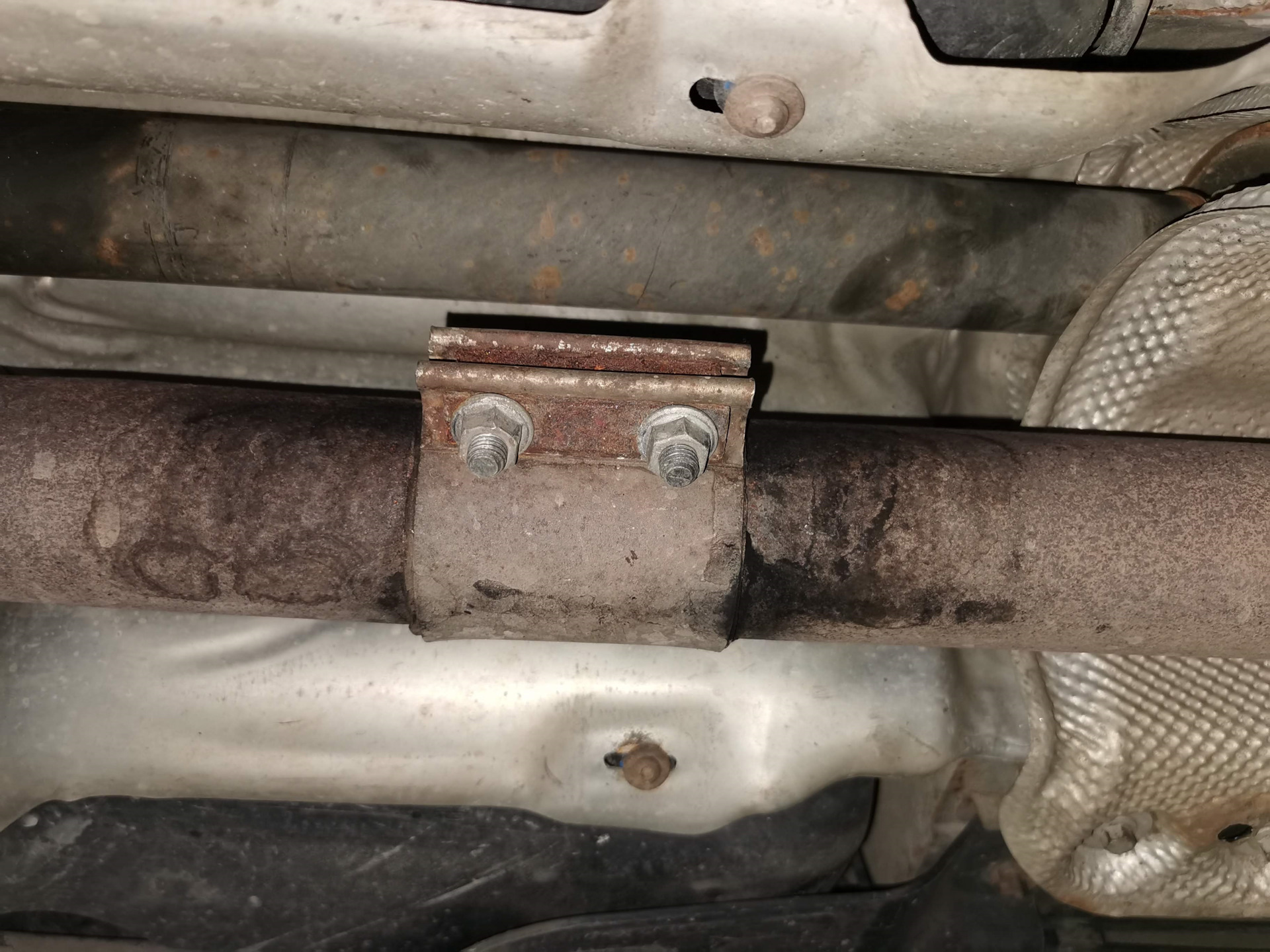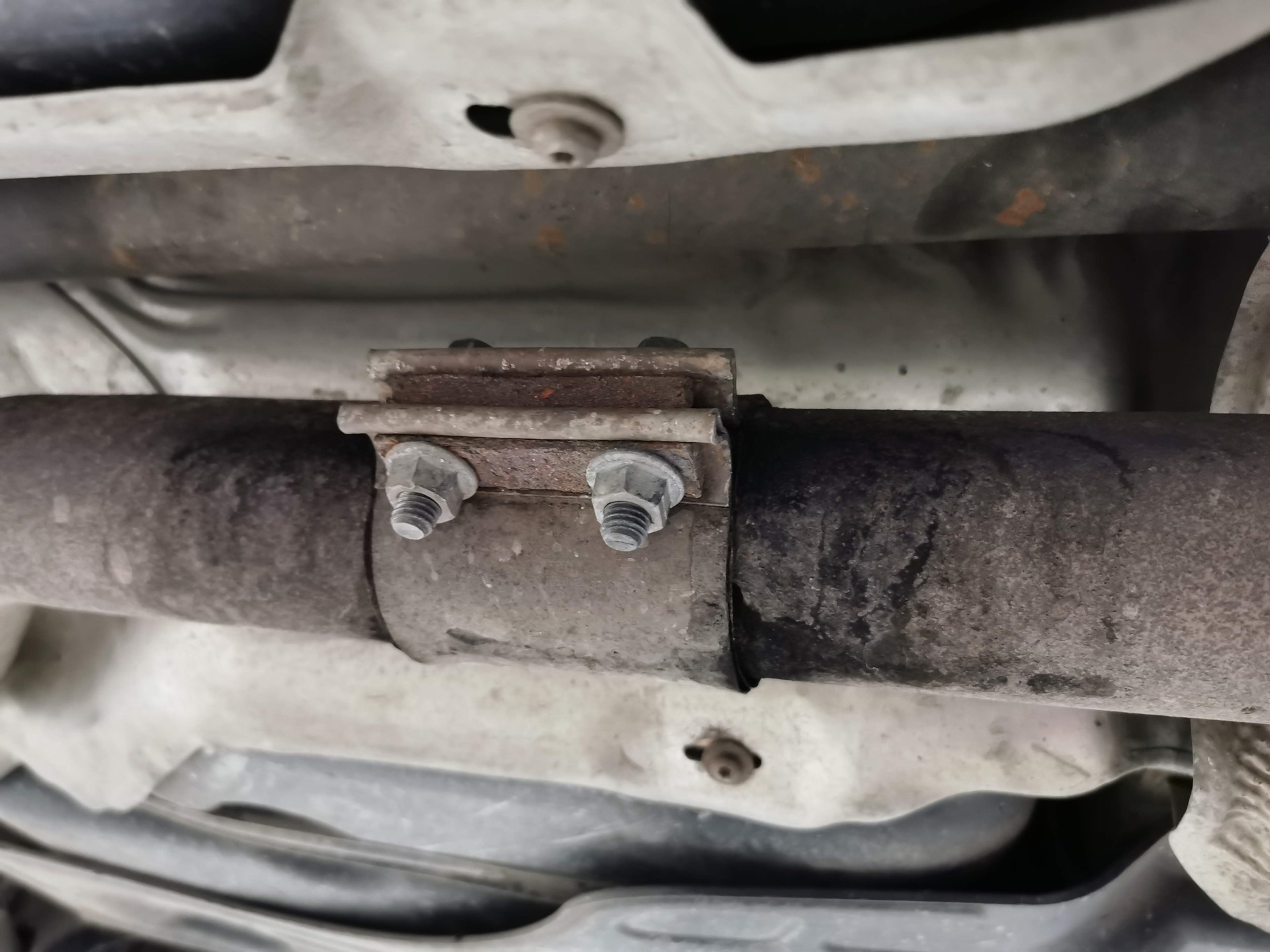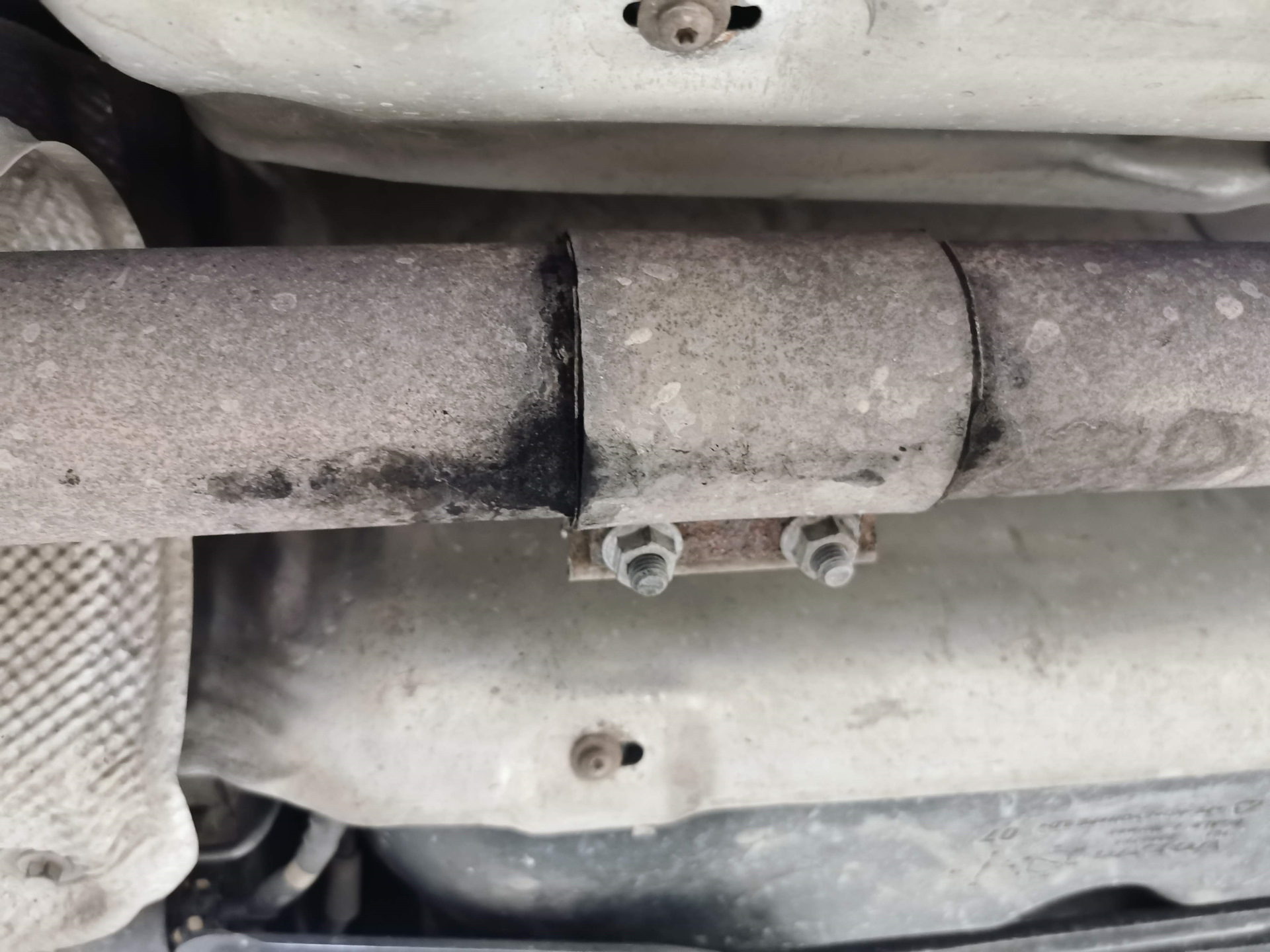 1. На очередном подъемнике случайно увидели, что из-под хомута сочленения выхлопной трубы (тот, который соединяет трубу в районе задней балки) были видны черные прострелы — хомут прогорел…