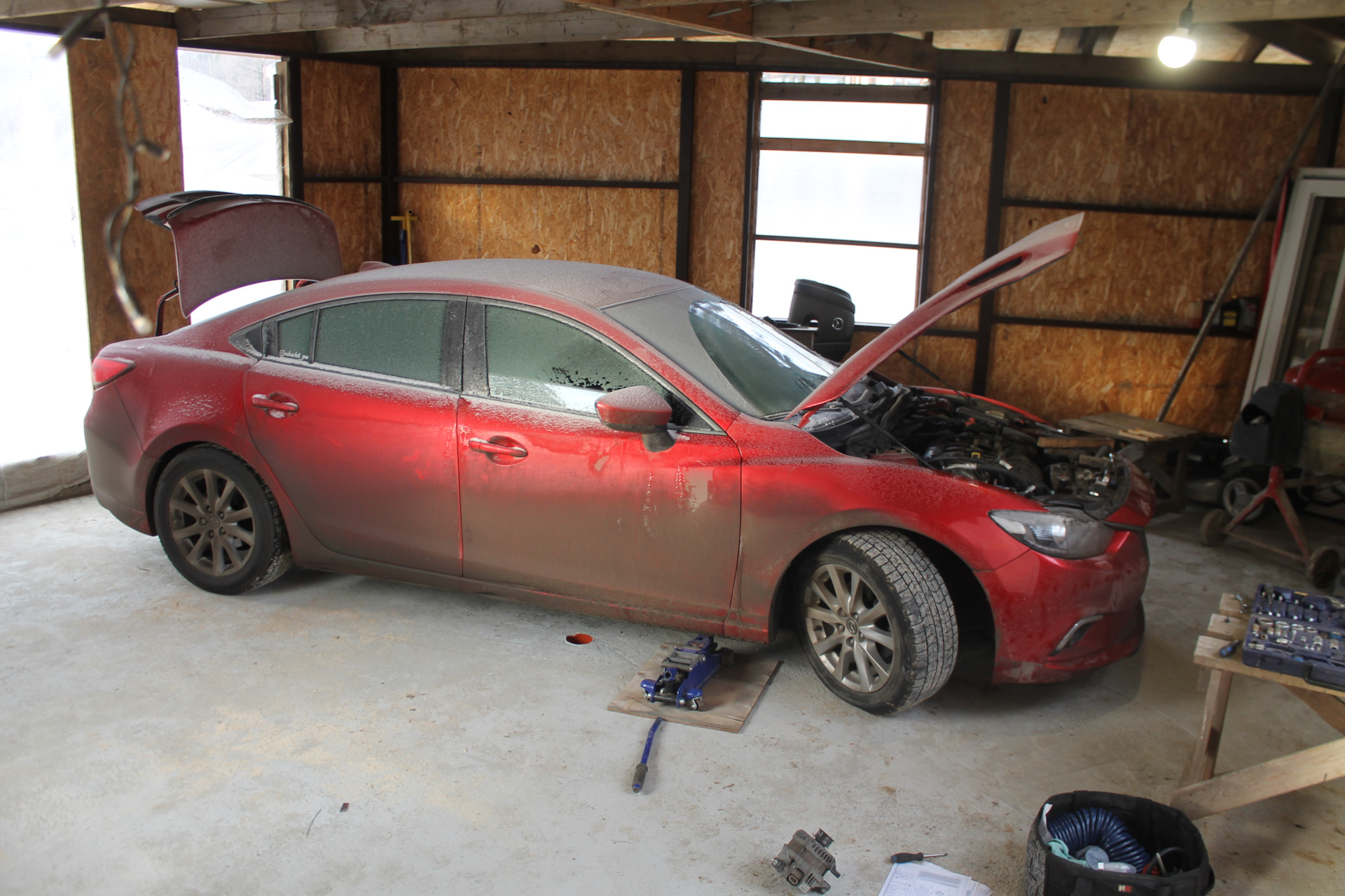 Сегодня впервые опробовал свой недостроенный гараж. Всё лучше, чем возиться на морозе.