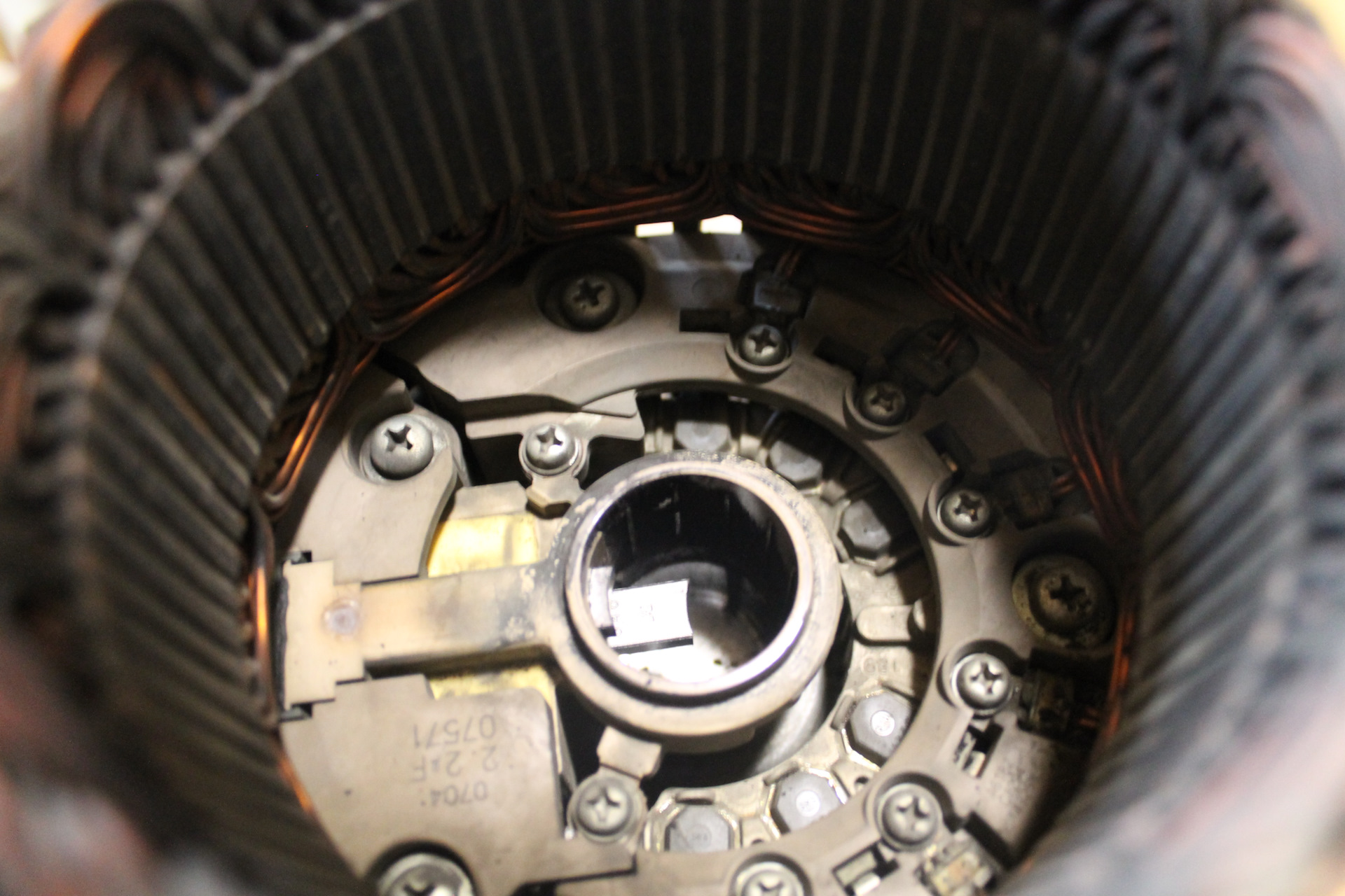 6 мелких винтов крепят обмотку статора, их крутить не надо. Ищем 4 самых крупных, они держат всю конструкцию обмотки и диодного моста на корпусе. Чтобы вынуть всю эту байду, переверните корпус, снимите пластиковую крышку на клемме генератора и выкрутите одну лишь гайку.