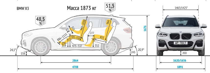 1) спереди — G01 146 см, F25 — 145 см, F48 — 140 см.