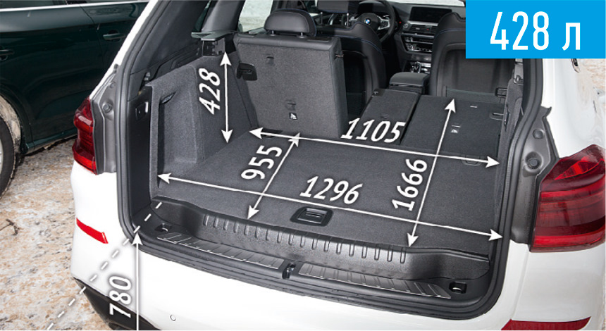 Ширина — тут интереснее, у G01 проем двери 129см и самое узкое место 110см, у F25 — 124см и 109см соответственно и у F48 — 132см и 100см. Но у X3 это по сути ширина по всей высоте, тогда как у F48 — только там где арки, а дальше — шире. Иначе бы коробка с 65" тв не влезла б в мой багажник )) — www.drive2.ru/l/566566523116717491/
