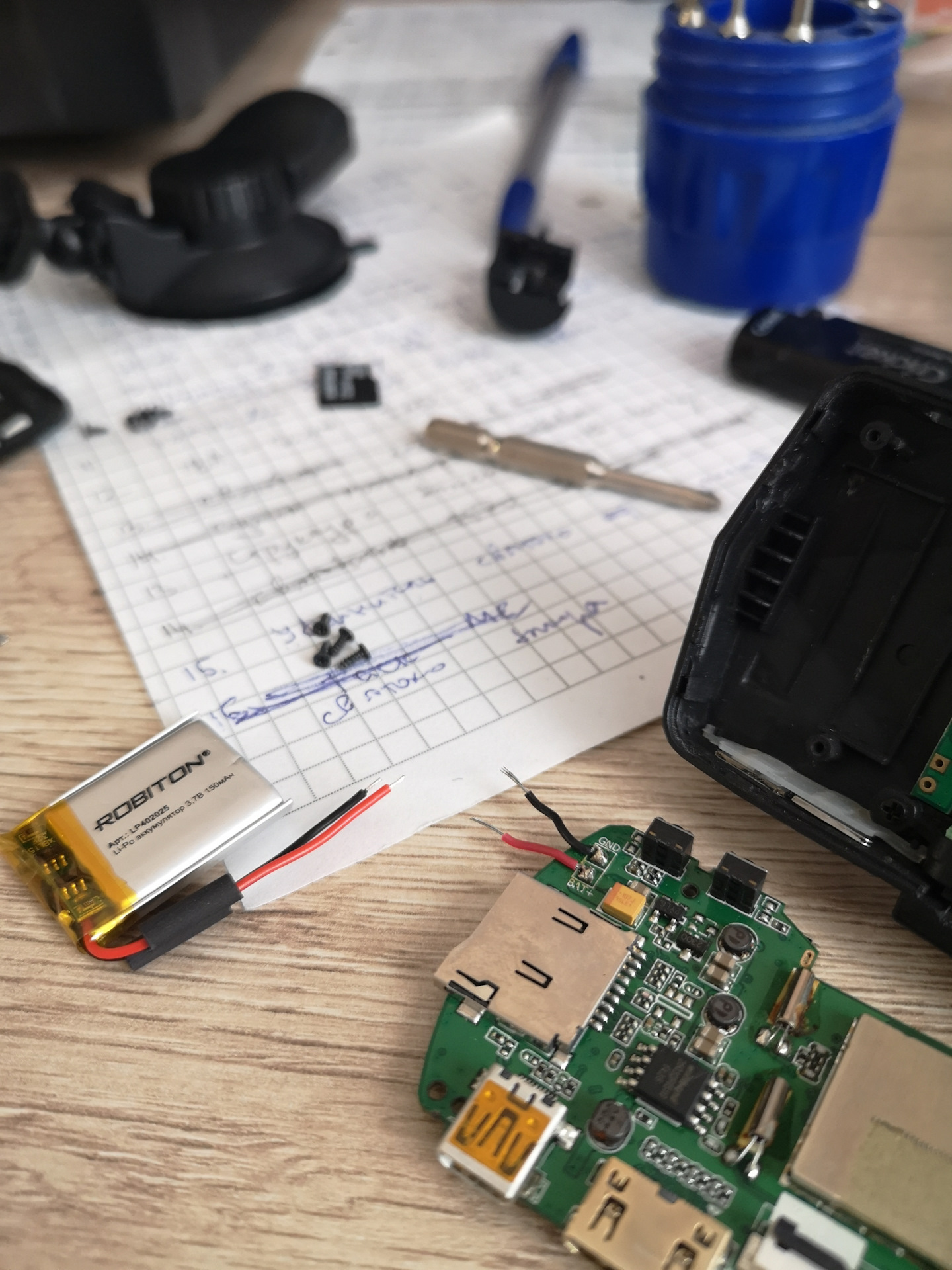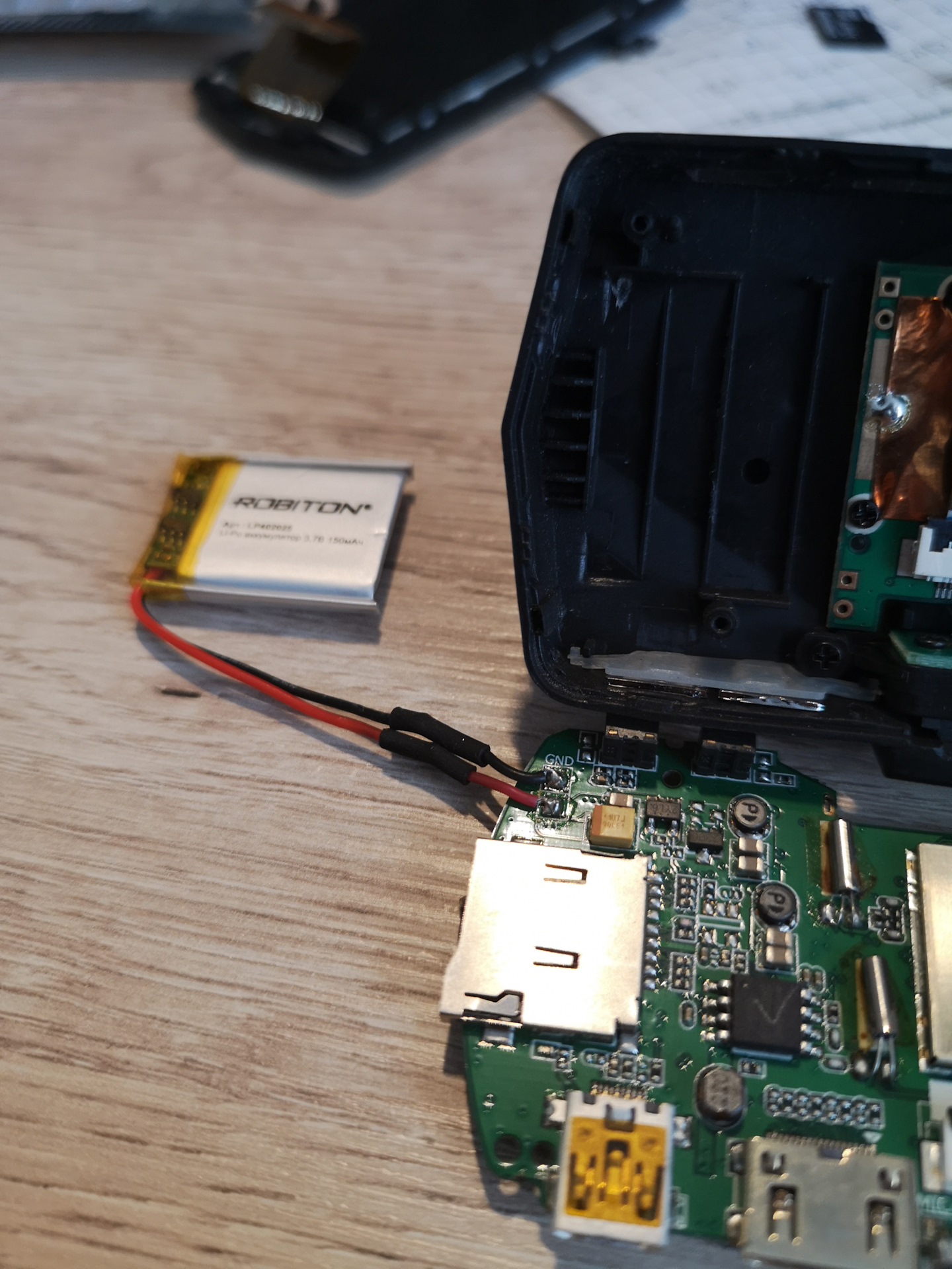 Ничто не предвещало беды, уверенно вскрываю регистратор, отрезаю старый аккумулятор, и впаиваю новый.
