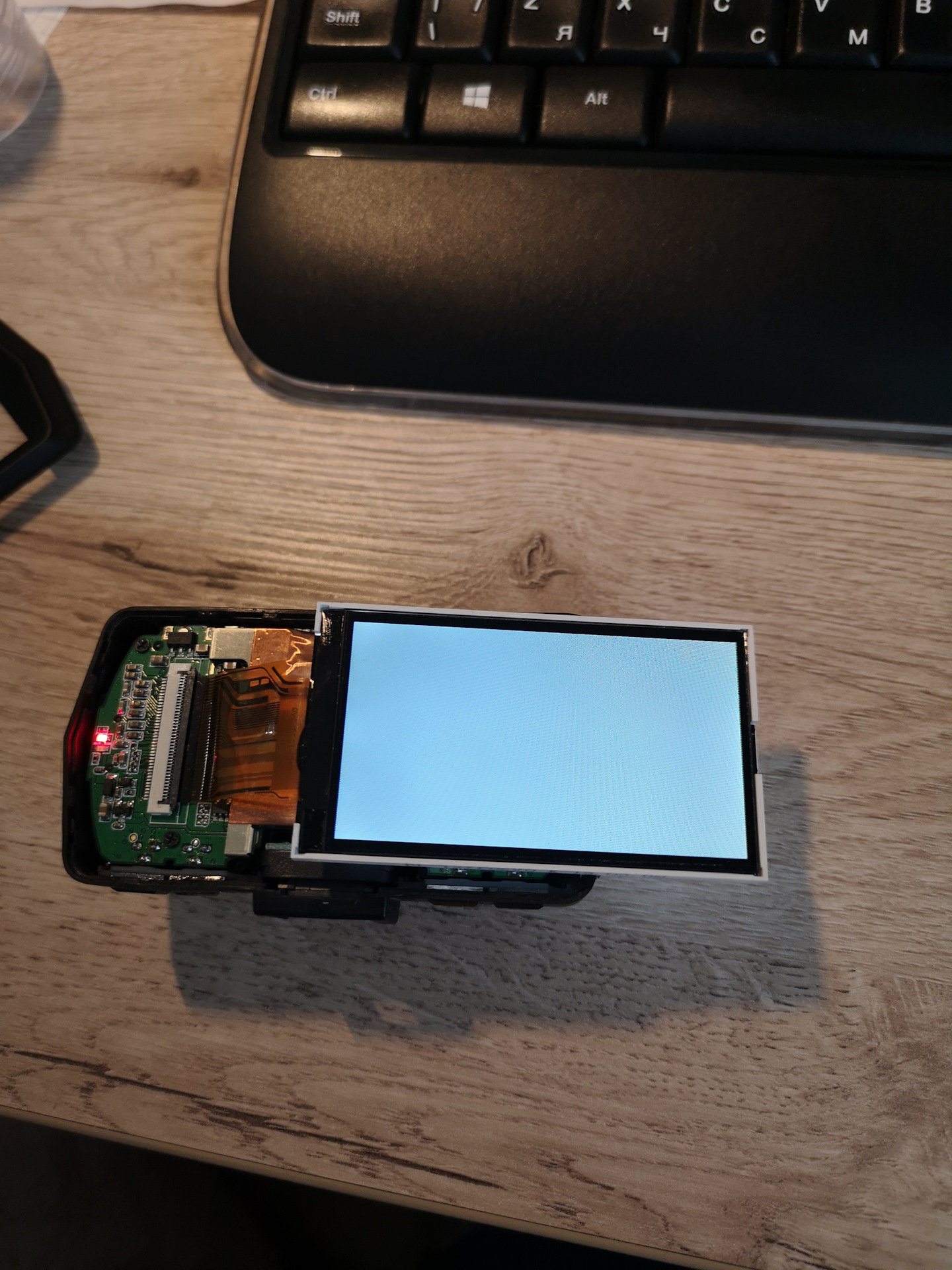 Делать нечего, собираю регистратор обратно с родным экраном. И он идеально показывает картинку. Я его просто потряс, вложил в корпус со смещением в долю миллиметра, и этого хватило, чтобы он заработал как прежде. Видимо, косяк в картинке наблюдается только когда к экрану приложено усилие в конкретной точке с конкретным усилием.