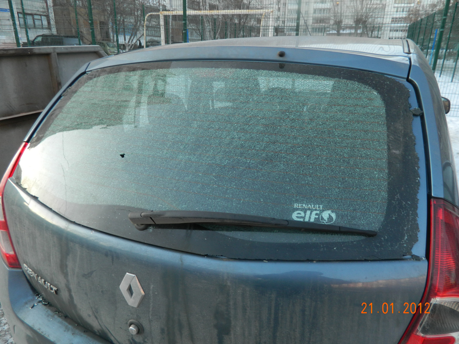 Это осыпалась часть заднего стекла. Когда хлопнул дверью еще раз, дыра стала совсем большой.
