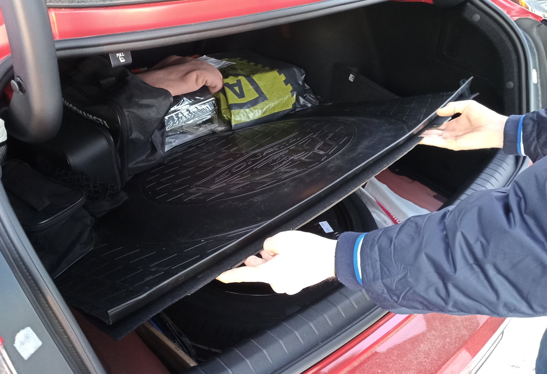 Попробовал найти ковер в багажник без "ушей", просто прямоугольный, не нашел. Ну что делать, взял ножницы да сделал кастрацию :D