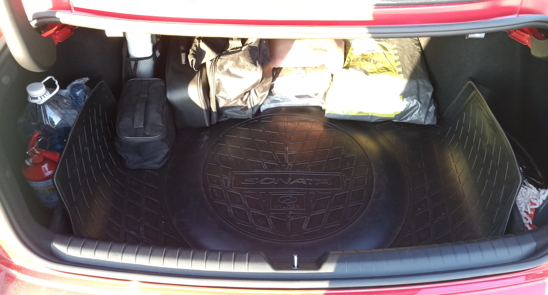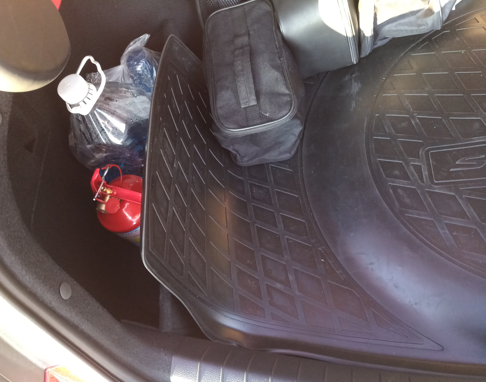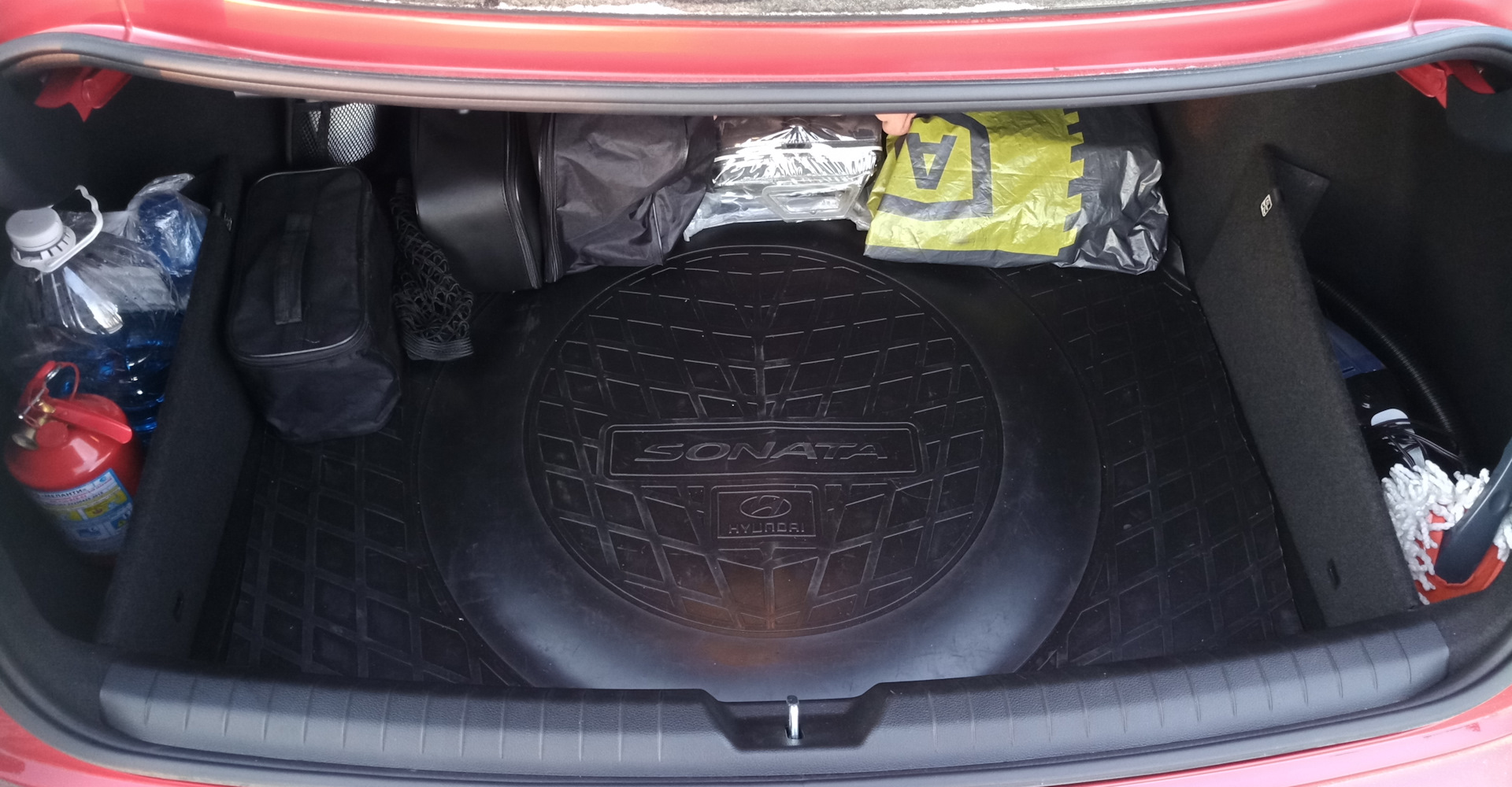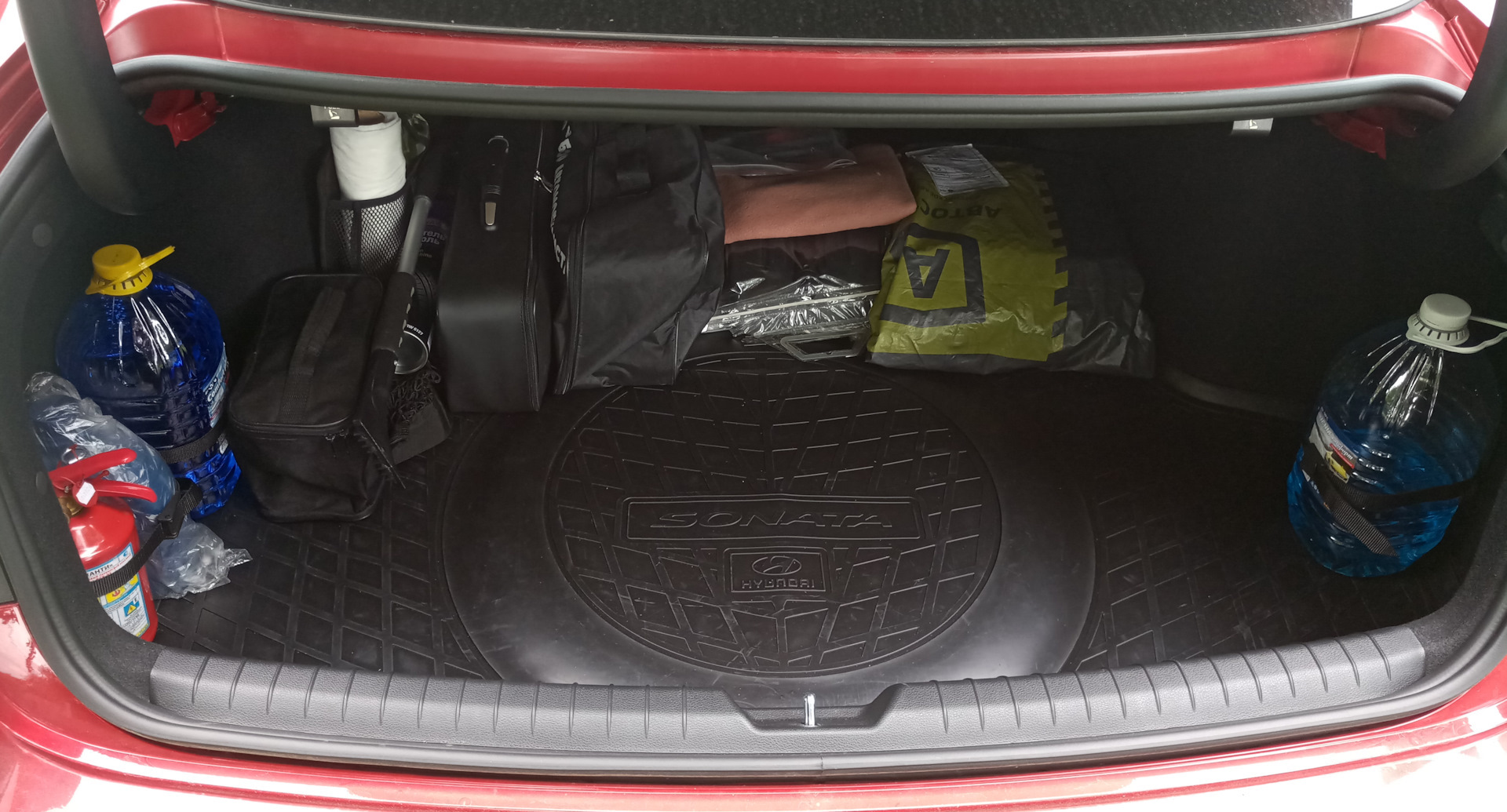 Ладно, уговорили, покажу как надо;) обычная среднеразмерная спортивная сумка (в данном случае Скечерс, куплена в Спортмастере). В ней лежат: дорожный набор от Хендэ (огнетушитель, треугольник, жилет), насос (разумеется электрический), набор тряпок (наример фары протирать), простыня (самая дешевая, покрываю задний ряд, когда складываю) штатная пепельница (не курим, надо было куда-то деть), дождевик (на всякий случай), складная лопатка (раскапываться на парковке), ключик на 10, рабочие перчатки (хотя они перекочевали в нишу двери) и наверно еще что-то, сходу не помню. Все это добро еще и прекрасно фиксирует бутыль омывателя (и раньше еще и пол-литра масла). Езжу так почти с момента покупки.