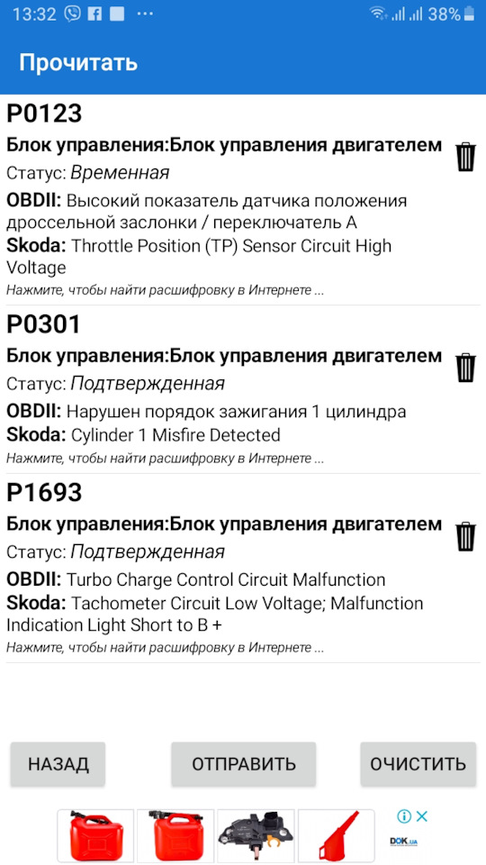 Ну так и есть — первая по дпдз, вторая пропуски в цилиндре 1, третья по замыканию в цепи контрольной лампы