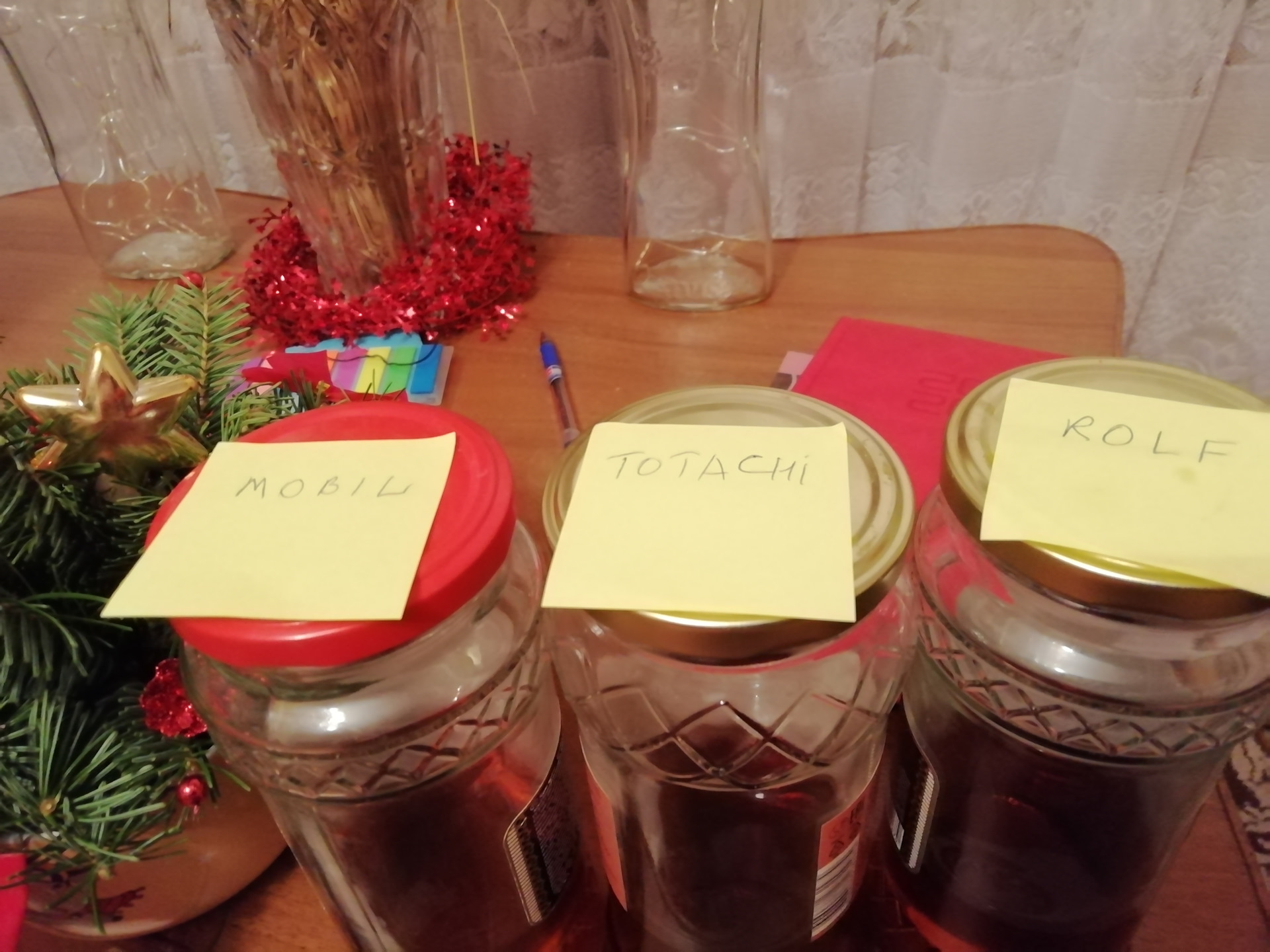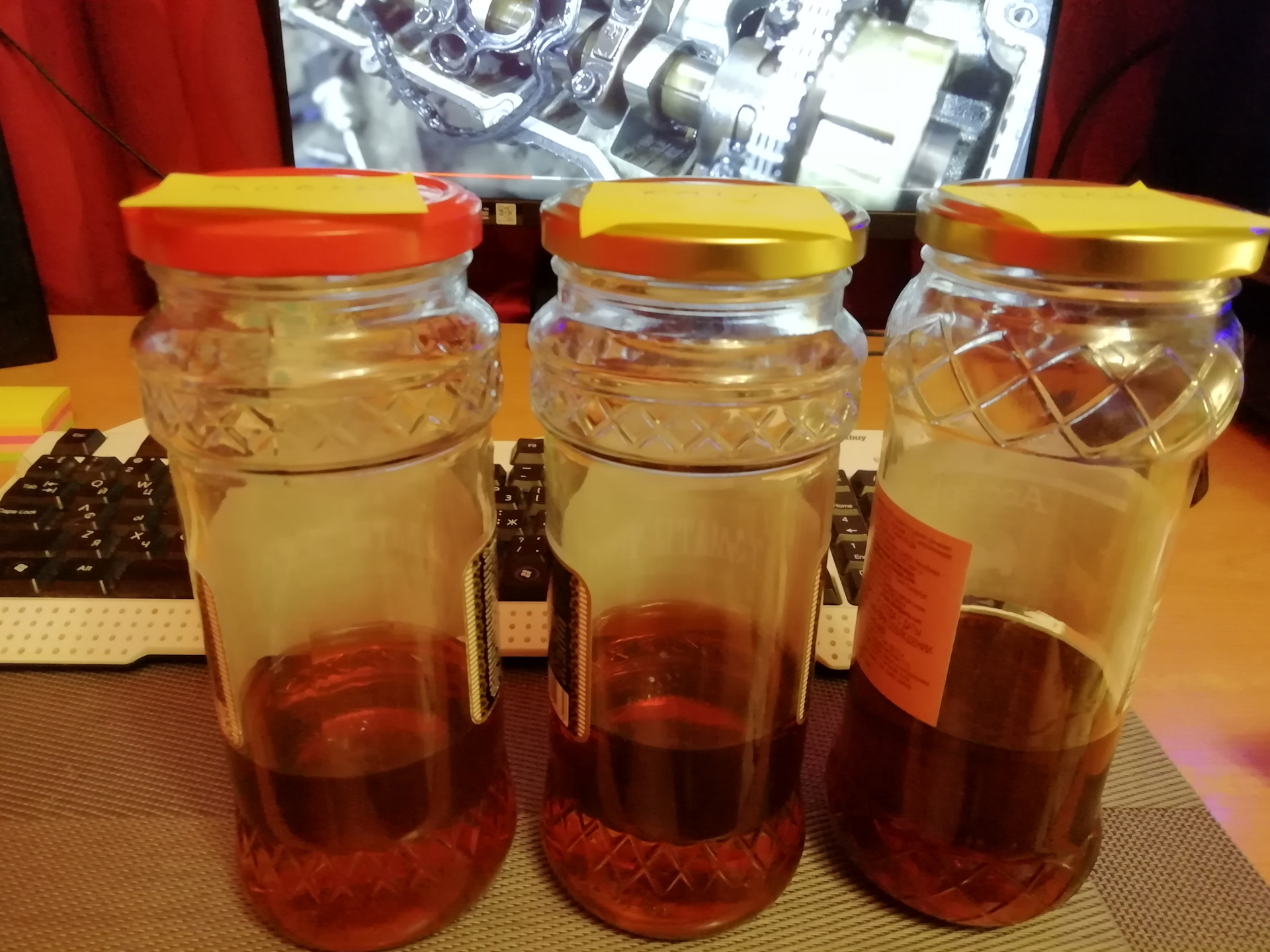 перевернув банки я обнаружил, что масло Мобил стекает немного хуже, т.е. стало гуще других, два других образца стекали одинаково. Использован очень точный прибор- глазомер называется. Температура на термометре — 36.