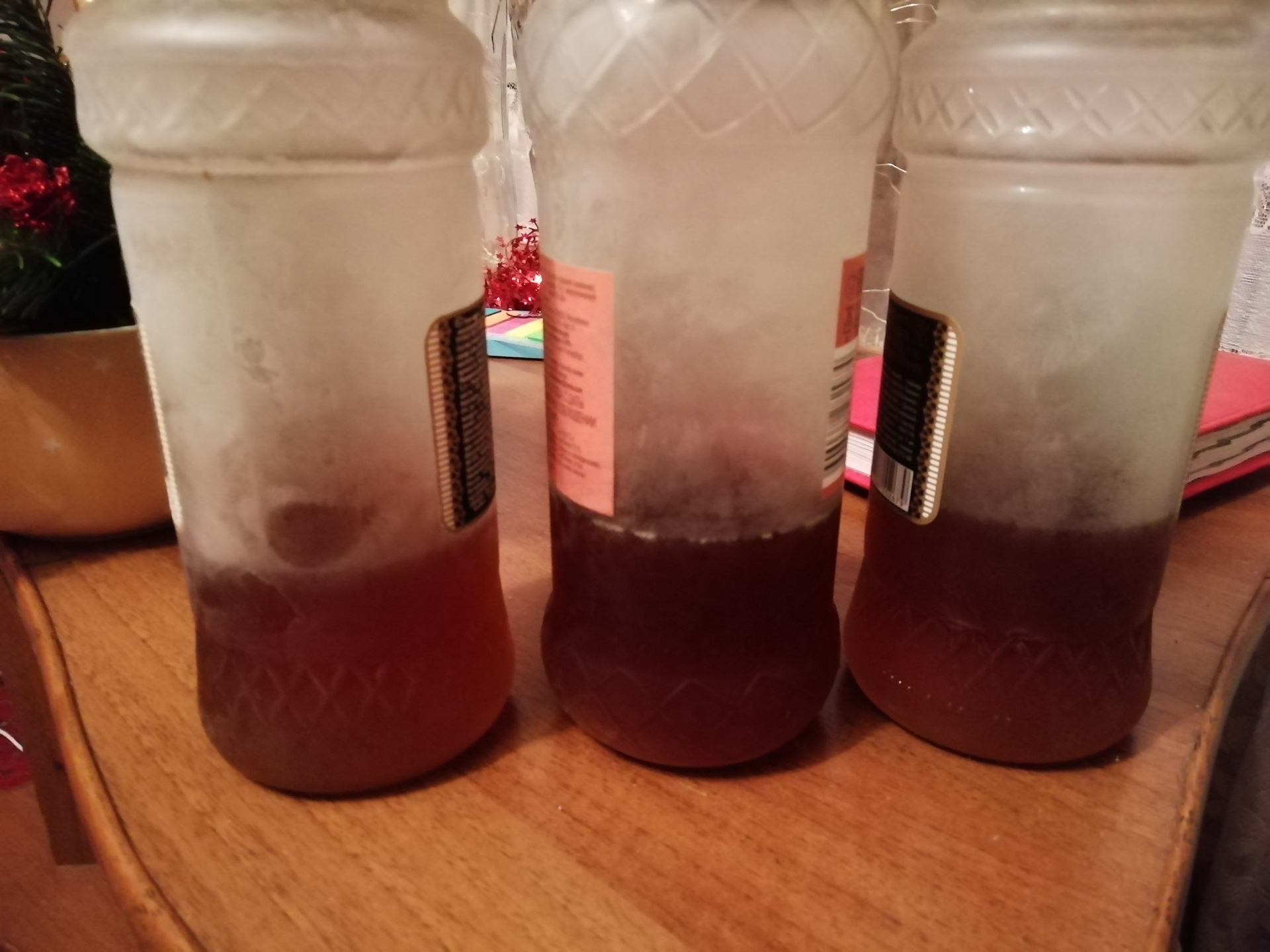 быстро перевернул банки, включил секундомер- масло в каждой таре стекло вниз за секунды, замерзнуть не успело, температура -37. Стоят в том же порядке, что и на фотографиях выше