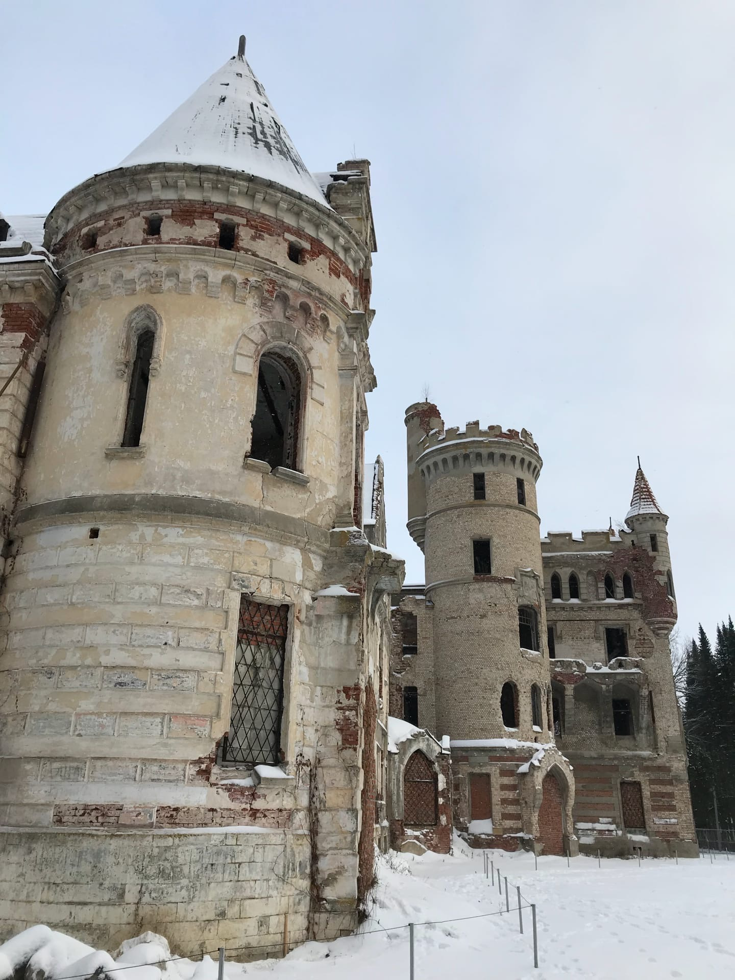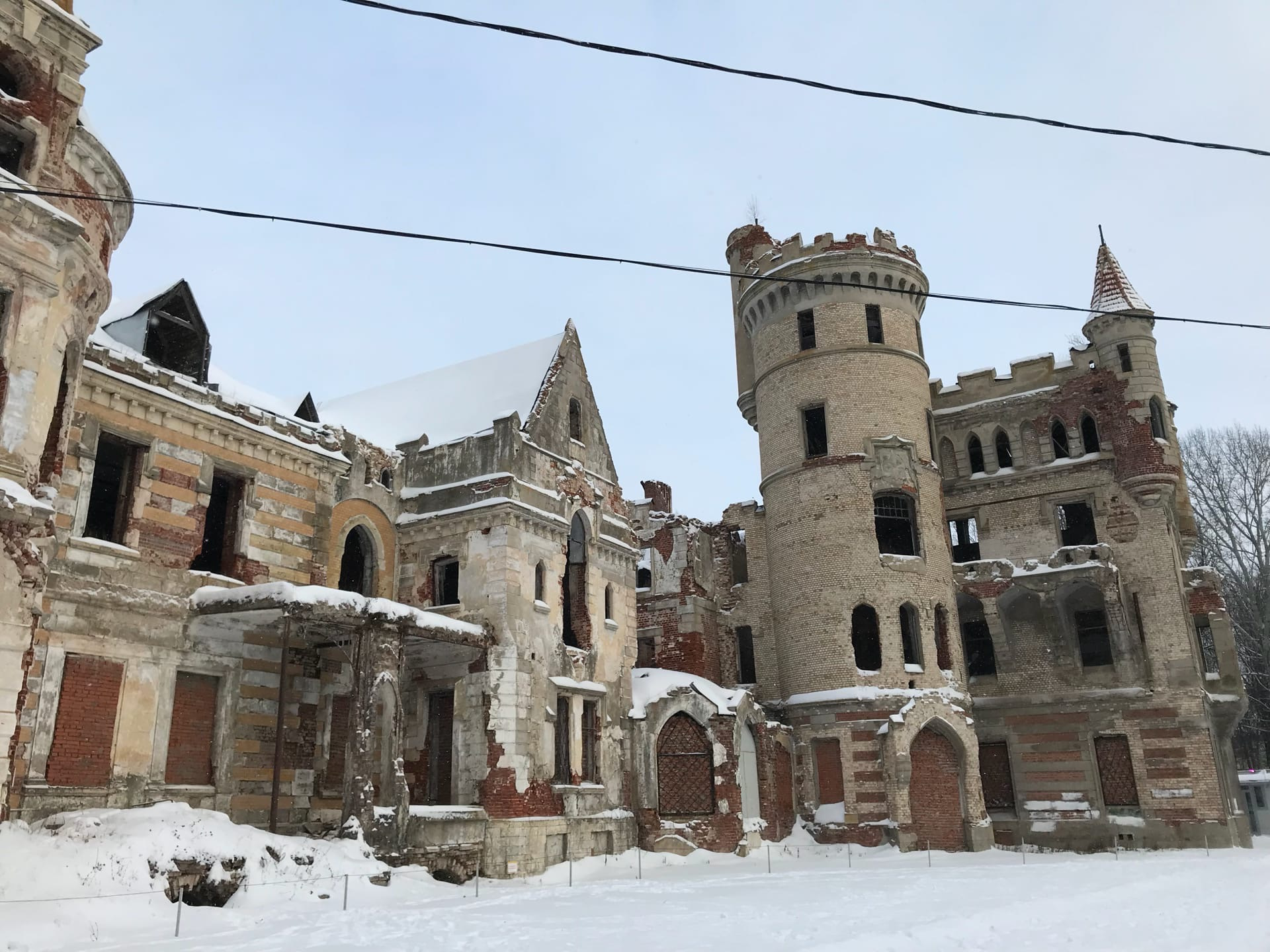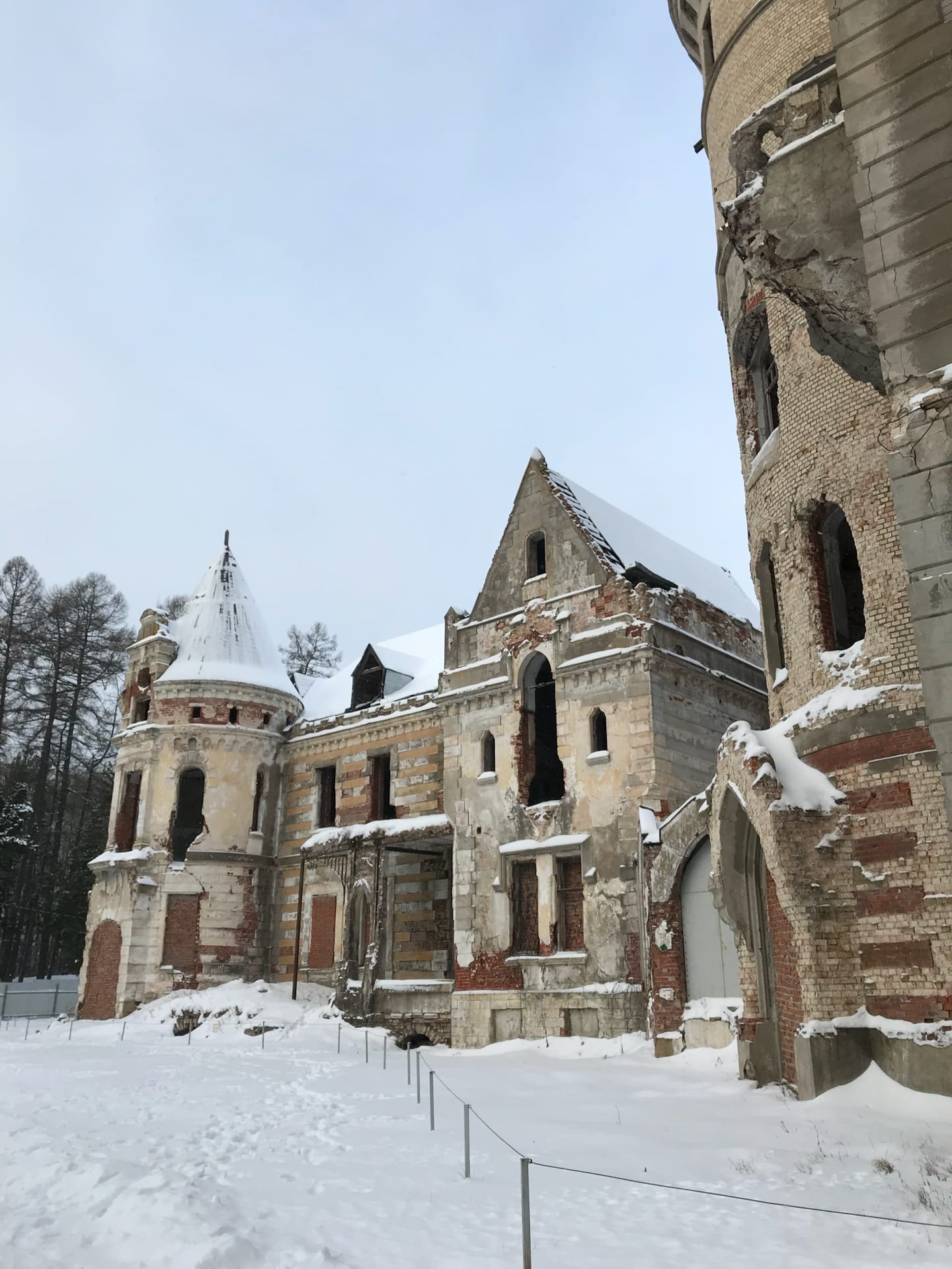 Усадьба прикольная, территория замка огорожена забором, вход через павильон, стоимость билета на 1 человека — 100 руб. Внутрь дома заходить нельзя, все двери и окна первого этажа заложены кирпичом. Замок крутой, башни как в дисней ленде)) Территория усадьбы огромная, вниз от замка идет пруд, лодочная станция :) Если бы все это отреставрировали, то посетителей было бы гораздо больше.