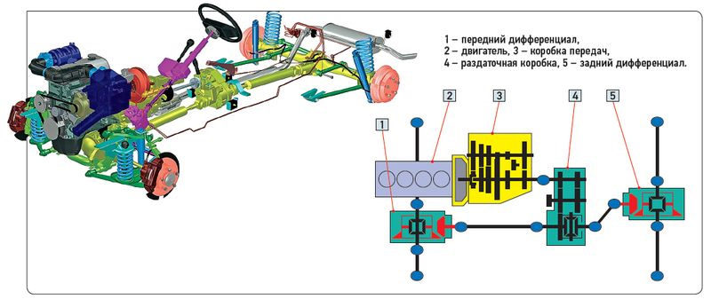 Автомобиль «Нива» – полноприводный, т.е. ведущими являются все колеса. Полный привод – постоянный: крутящий момент от двигателя всегда передается сразу на обе оси (мосты не отключаются). Такая схема повышает проходимость автомобиля, одновременно снижая нагрузки на узлы трансмиссии, но несколько увеличивает расход топлива.