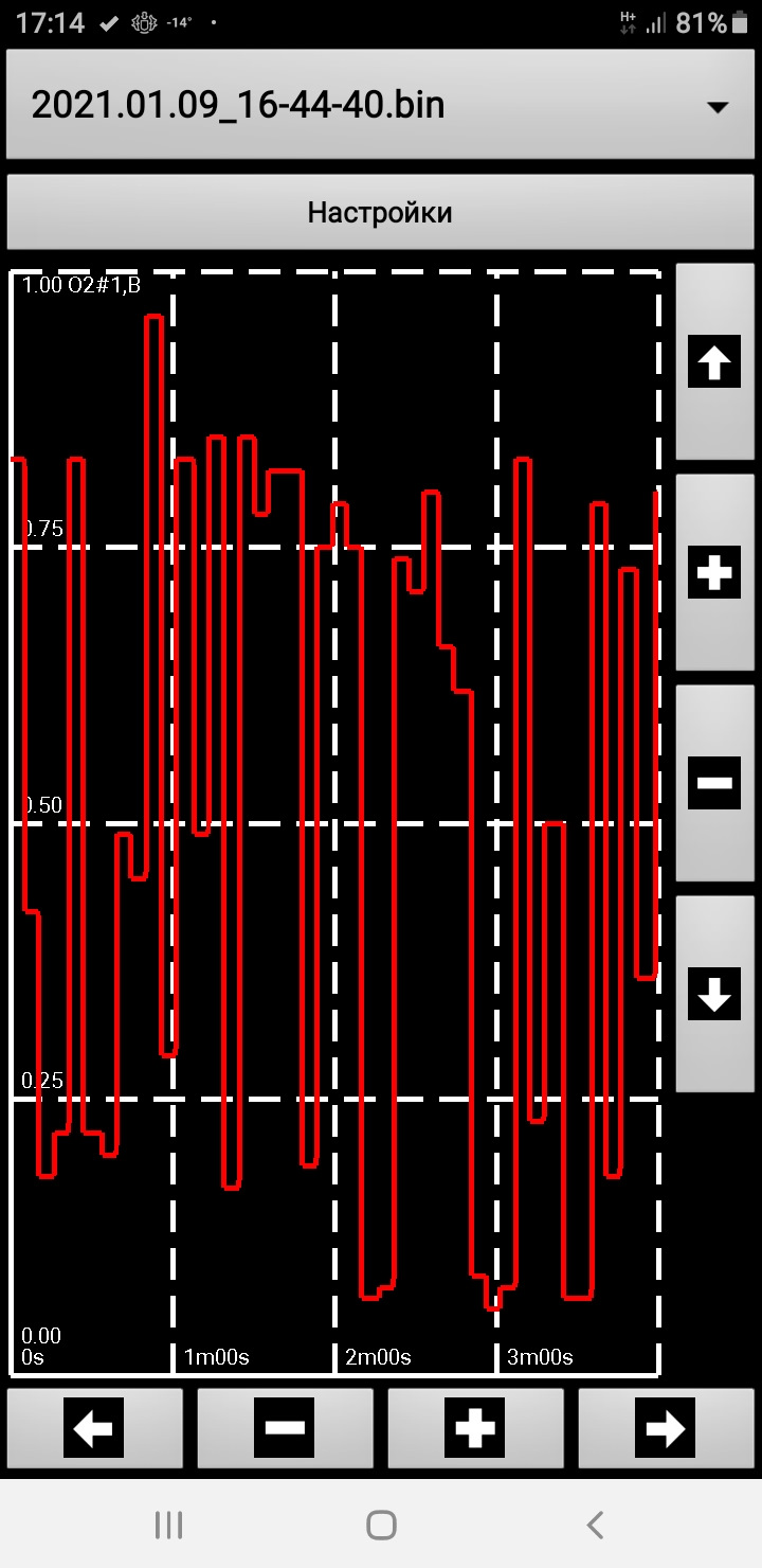 Кнопка Графики — Настройки — Вкл галочку запись логов — Количество графиков на странице выставить 1 — Выбрать в график 1 "О2 сенсор #1".