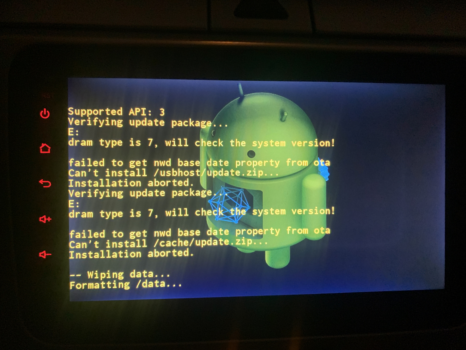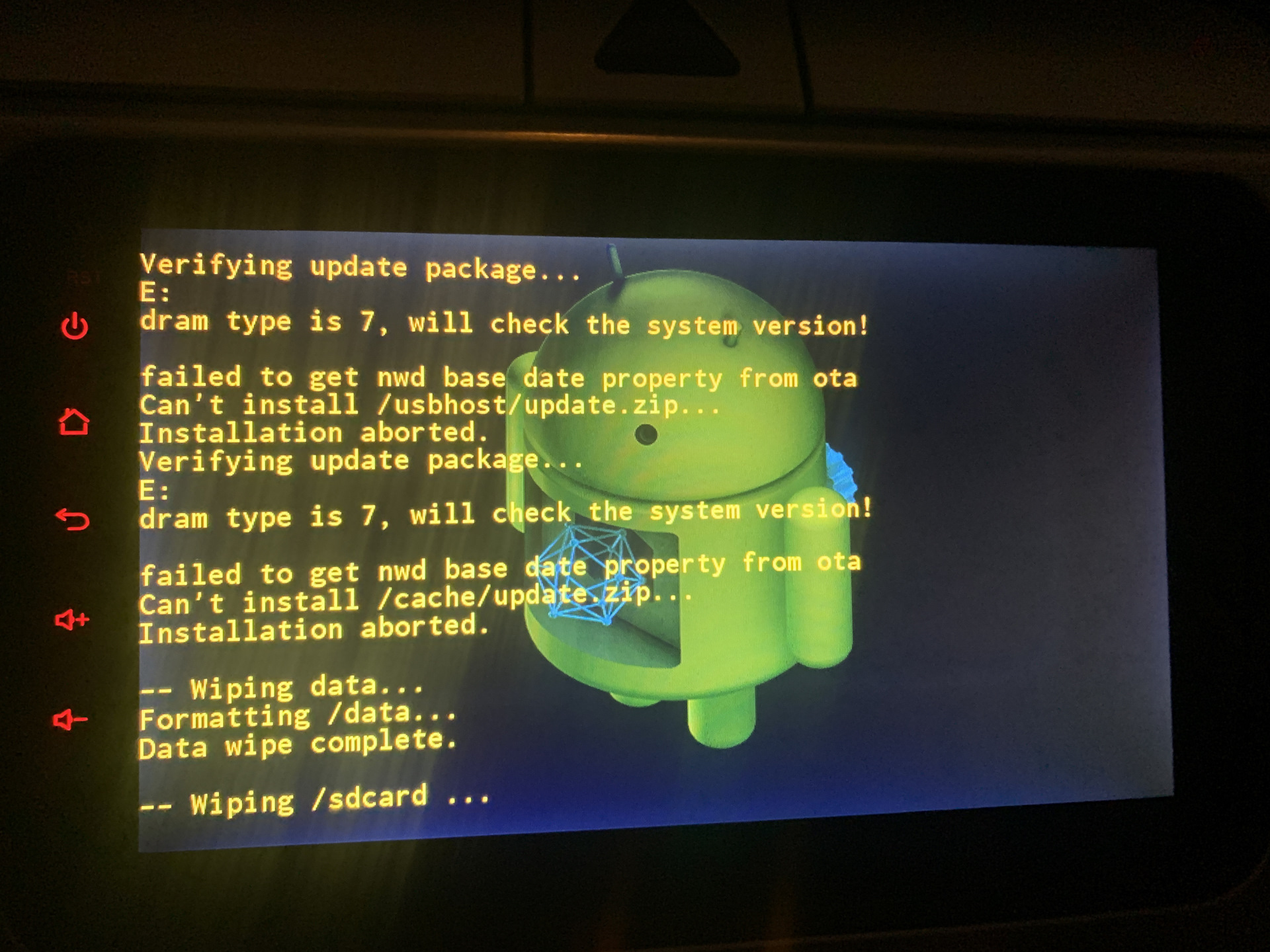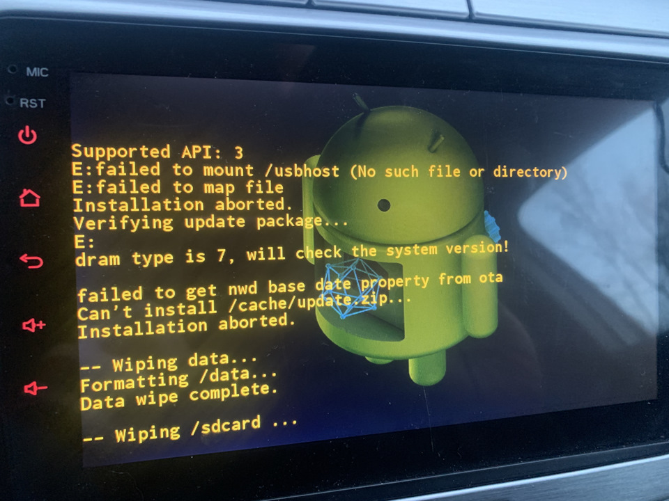 По итогу магнитола теперь постоянно перезагружается и показывает зелёный логотип, чёрный с иероглифами и значок ошибки с текстом последней фотографии.