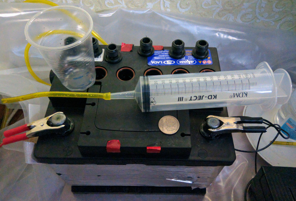 Оригинально — корректировка плотности разрядом? Т.е. в итоге лишняя кислота просто перешла в пластины при разряде, увеличив тем самым сульфатацию АКБ и вы это назвали корректировкой плотности? Думаю здесь нужна была обычная корректировка замещением — это когда батарея заряжается до тех пор, пока плотность в течение 12 часов не перестанет расти, затем плотность корректируется путем отбора электролита из банки с помощью шприца и разового пластикового стаканчика: если хотим понизить плотность на одну точку (сотую долю г/см3) — отбираем 10 мл. электролита из банки АКБ (и не выбрасываем его, а сливаем в бутылку, которую надписываем маркером — пригодится ещё!), затем ровно столько же добавляем воды взамен… Вот и всё, если надо понизить на две точки — отбираем 20 мл. и столько же добавляем воды, если на три точки — 30 мл… и т.д. Чтобы корректировать плотность, вовсе не требуется лить воду под самые крышки аккумулятора, как ошибочно думают некоторые. Единственное условие, это максимальный заряд в начале корректировки. Уровень же электролита, если вдруг он слишком высок (на что пожаловались вы), легко понижается с помощью такого "технологичного" набора, из ближайшей аптеки: