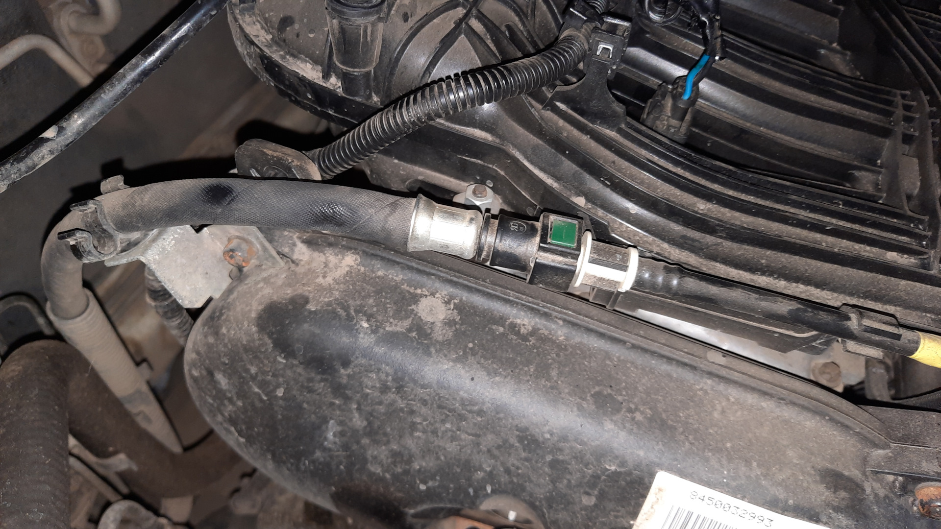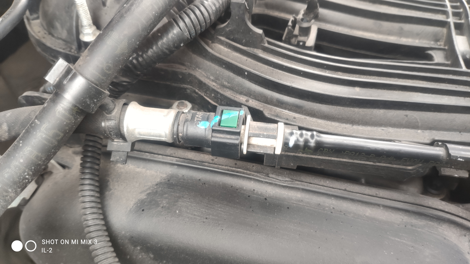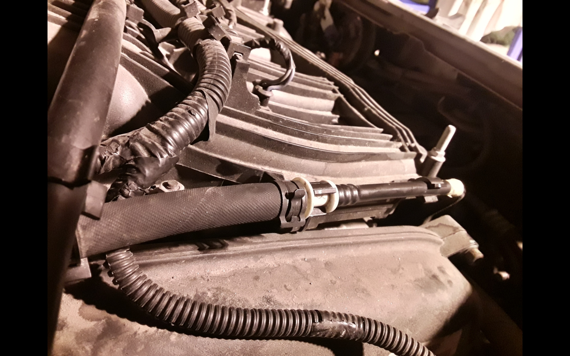 Вот, аккуратная пластиковая легкая трубочка с фиксацией по обе стороны быстросьёма, а на 1.8 повесили тяжеленный толстый резиновый шланг, который выламывает разъём. Штатное крепление за обратку бачка ОЖ не поставили при замене рампы, это я уже потом сделал сам, но не очень помогает