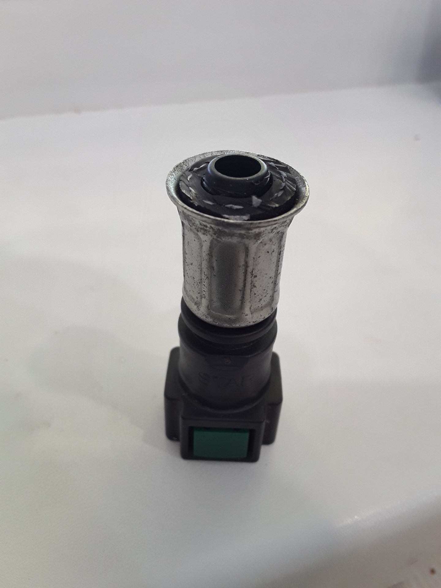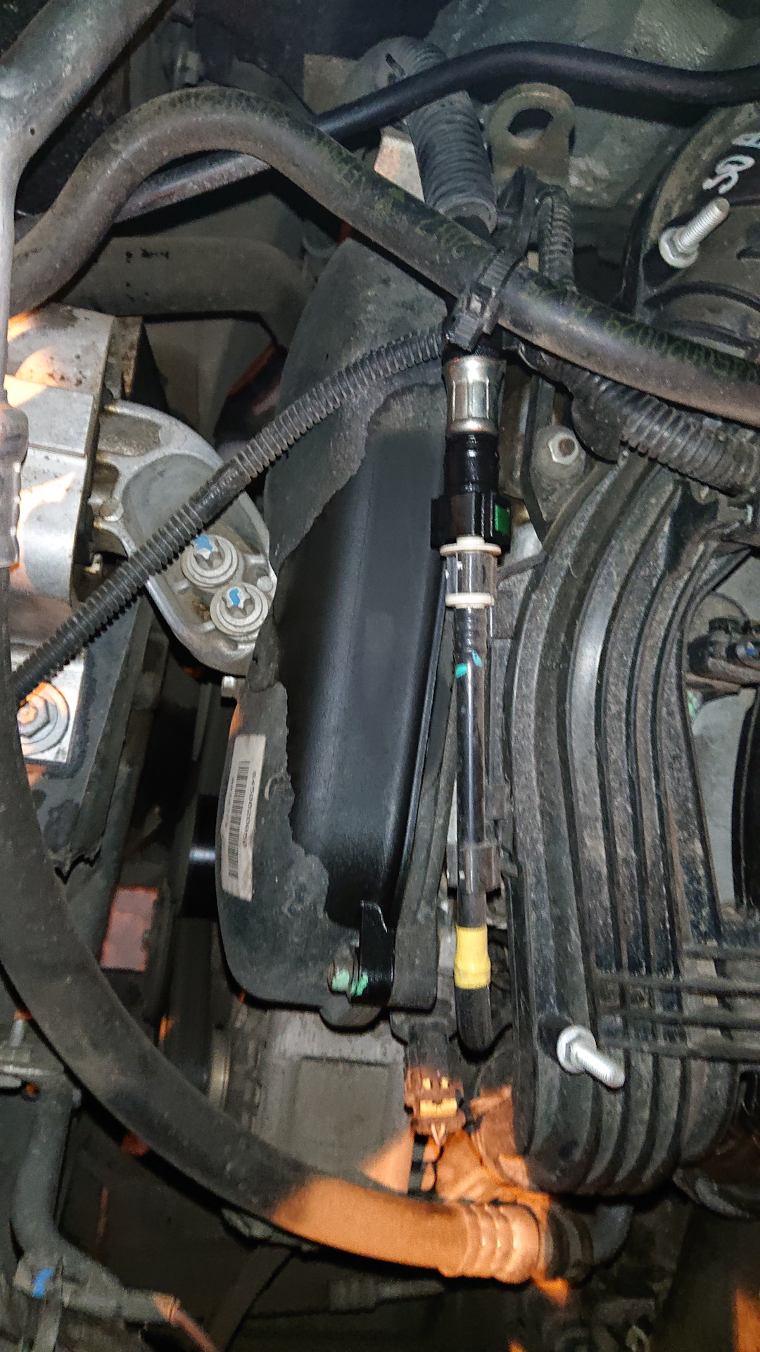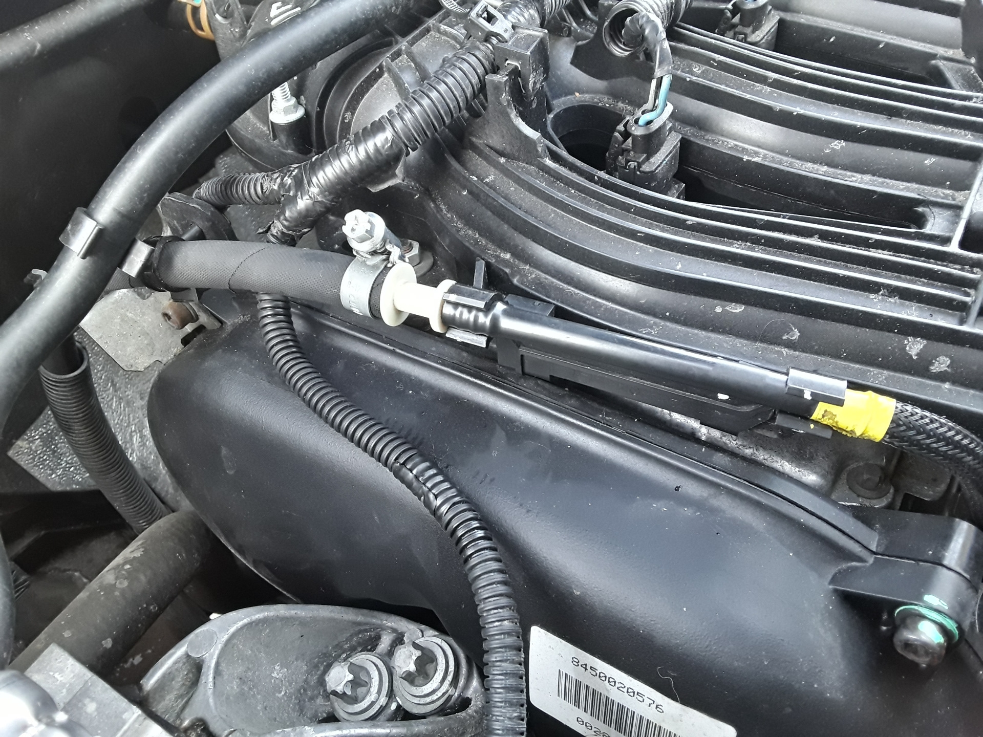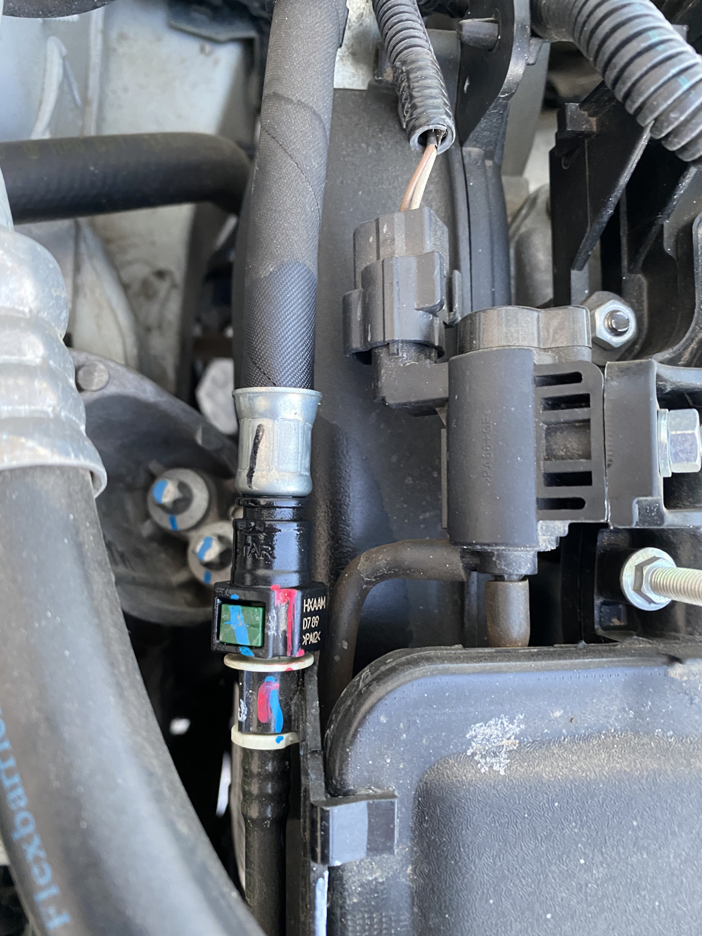 Вот, аккуратная пластиковая легкая трубочка с фиксацией по обе стороны быстросьёма, а на 1.8 повесили тяжеленный толстый резиновый шланг, который выламывает разъём. Штатное крепление за обратку бачка ОЖ не поставили при замене рампы, это я уже потом сделал сам, но не очень помогает