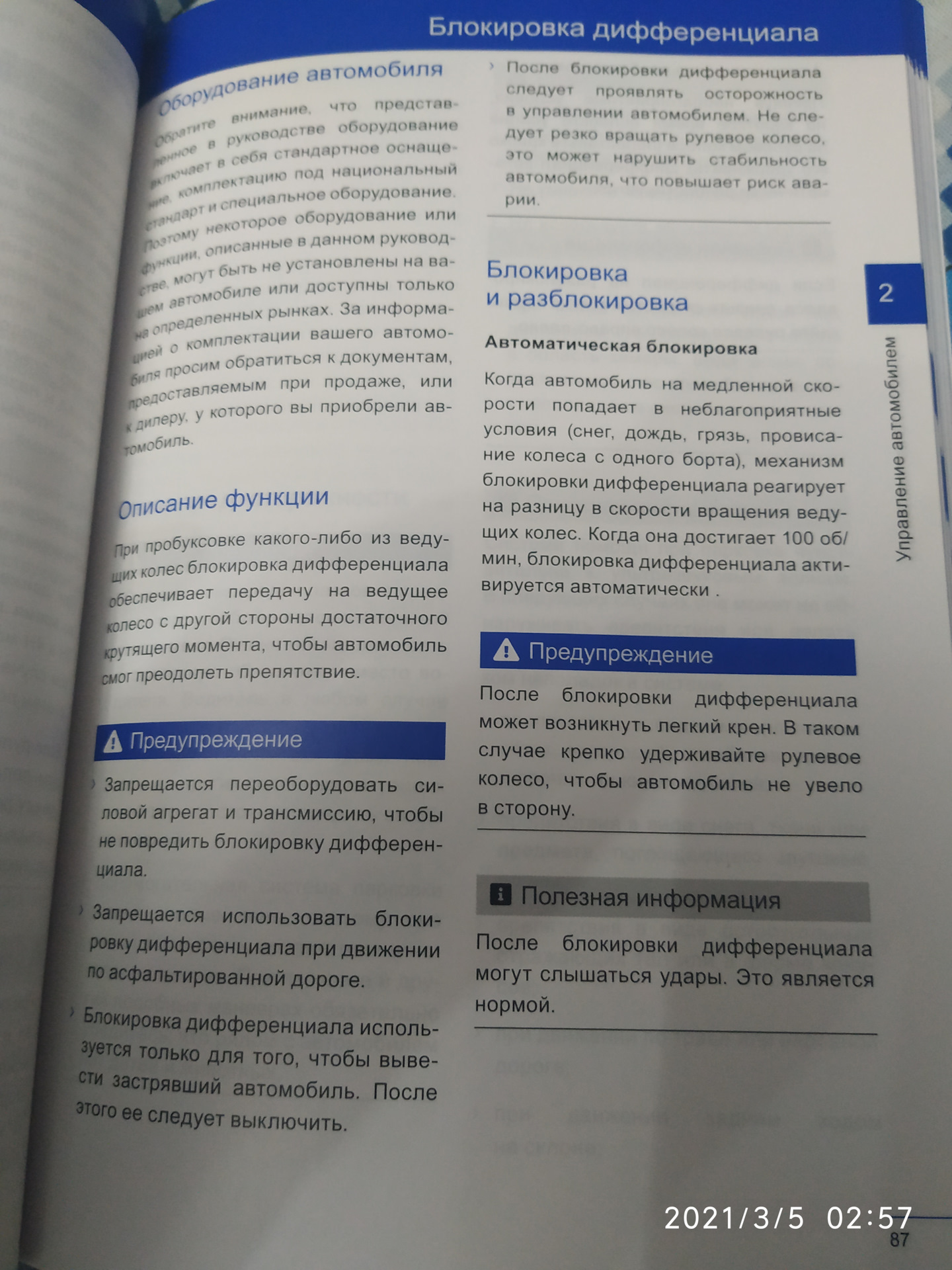 Кста, листал инструкцию искал как обновить показания датчиков давления в шинах, не нашел. Зато нашел более интересную информацию. Потом баловался на обледенелой горочке/кочке так-сяк вывешивал — дифференциал самоблокирующийся!
