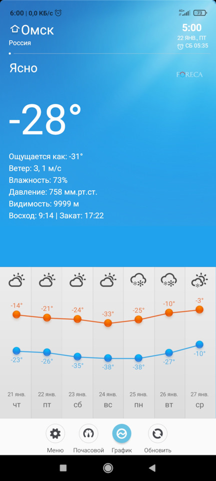 Влажность воздуха у нас высокая в Омске, часто бывает и 70-80% а иногда и 90%, так что прогноз пишет -30 по ощущениям -45 из за влажности воздуха.