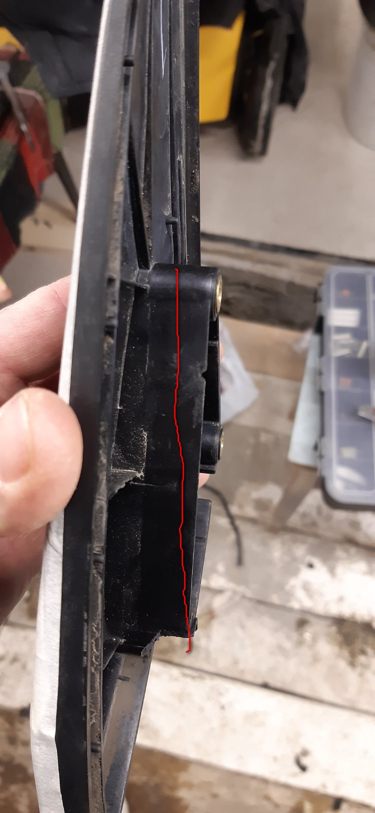 дополняю свой пост про зеркала .Зеркала от Rav4 ХА20 2001-2005 гг снимаем обшивку и старое зеркало, снимаем резинку с нового зеркала прикладываем её на место старого зеркала, размечаем места новых отверстий, теперь берём само зеркало прикручиваем к двери отмечаем что нам не нужно и обтачиваем, кант по двери и площадку с креплением (примерно как я нарисовал красным) дальше обклеиваем кромку двери моляркай и наносим шпаклёвку для придания формы двери, подмазываем стекло пока зазор не устроит.Провода на регулировку я достал из фишек поменял местами, подогрев я делал раньше мне только подключить нужно было. Вот и все ездим радуемся. Зеркала у меня были от леворульной