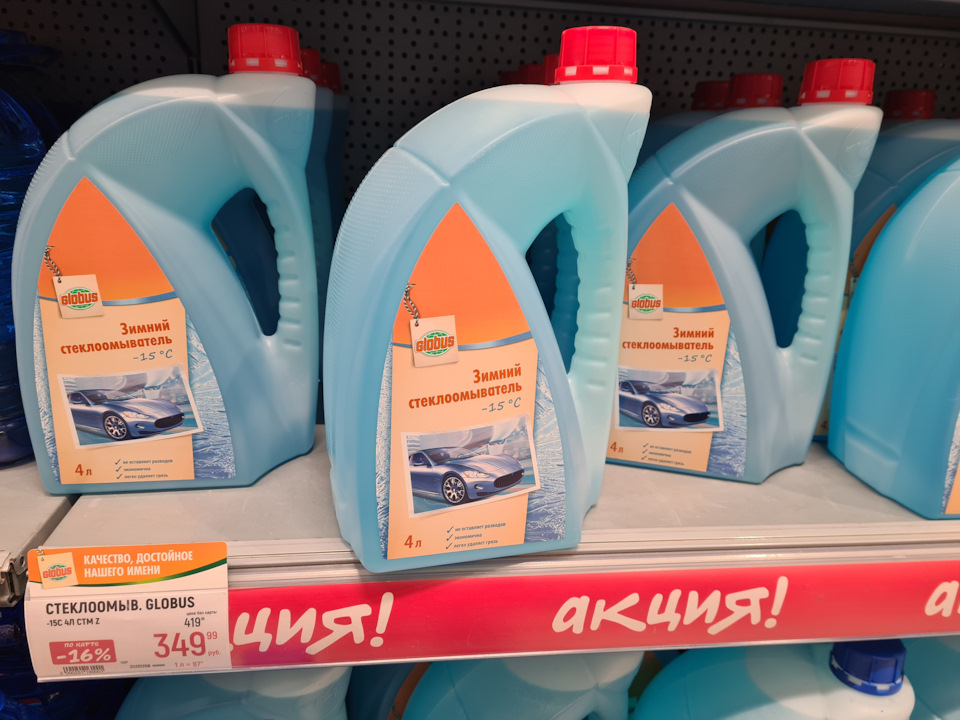 В Москве днём было до +10°C, вечерами и ночью около +4°C. Поездка планировалась на Юг, в более холодные земли. Решил что лучше слить всю летнюю жидкость очистителя и залить зимнюю, чтобы точно ничего не замёрзло по дороге. Но вот незадача — ни на МКАД, ни у ТТК, нигде вообще не было ребят на жигулях с эффективной и недорогой незамерзайкой, которая без истории происхождения, но весьма высококачественная. На рынок в Южный порт я уже не успевал, поэтому решено было купить что попалось, а попалась незамерзайка марки "Глобус" в одноименном магазине. Глобус, до -15°C, по цене около 300 руб за 4л. Тогда я не знал, насколько это низкокачественный продукт. Слил всю летнюю, залил зимнюю, прогнал через систему все остатки.