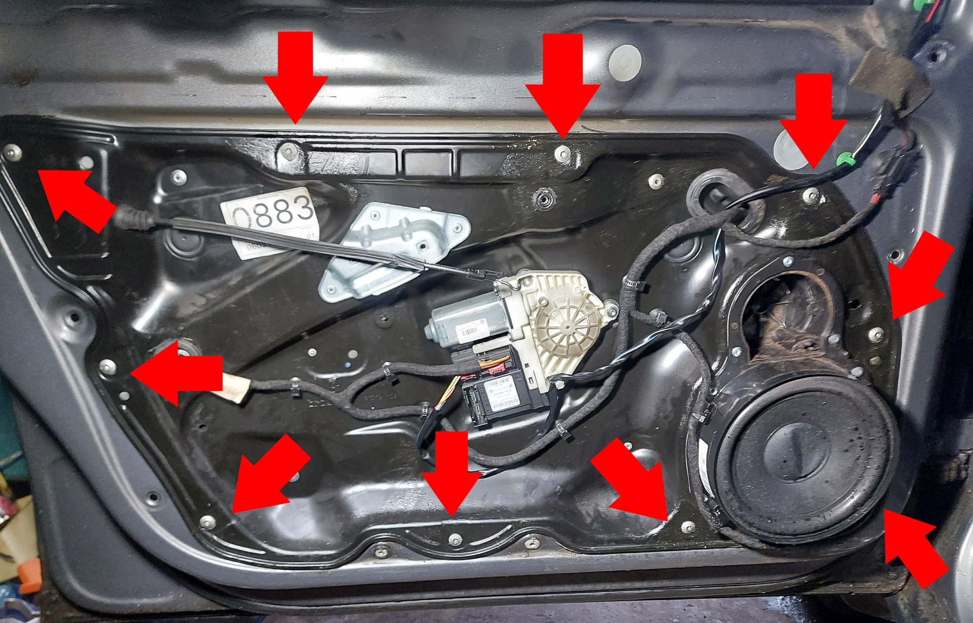Откручиваем (головка Т30) 10 винтов (оригинальный номер: WHT002109 — M6×10) внутреннего щита с механизмом стеклоподъемника: