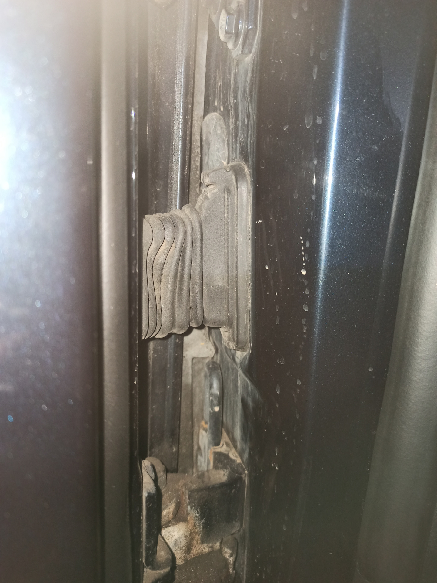 Ранее снимал, промывал, промазывал — на 2 года хватило, с морозом снова начал клинить. Сейчас поставил новый, густо промазав силиконом, и на трос, где вертикально подходит, намотал тонкий поролон, пропитанный силиконом. Думаю, что конденсат с металла затекает под оплетку, а так поролон в виде юбочки защитит от воды.