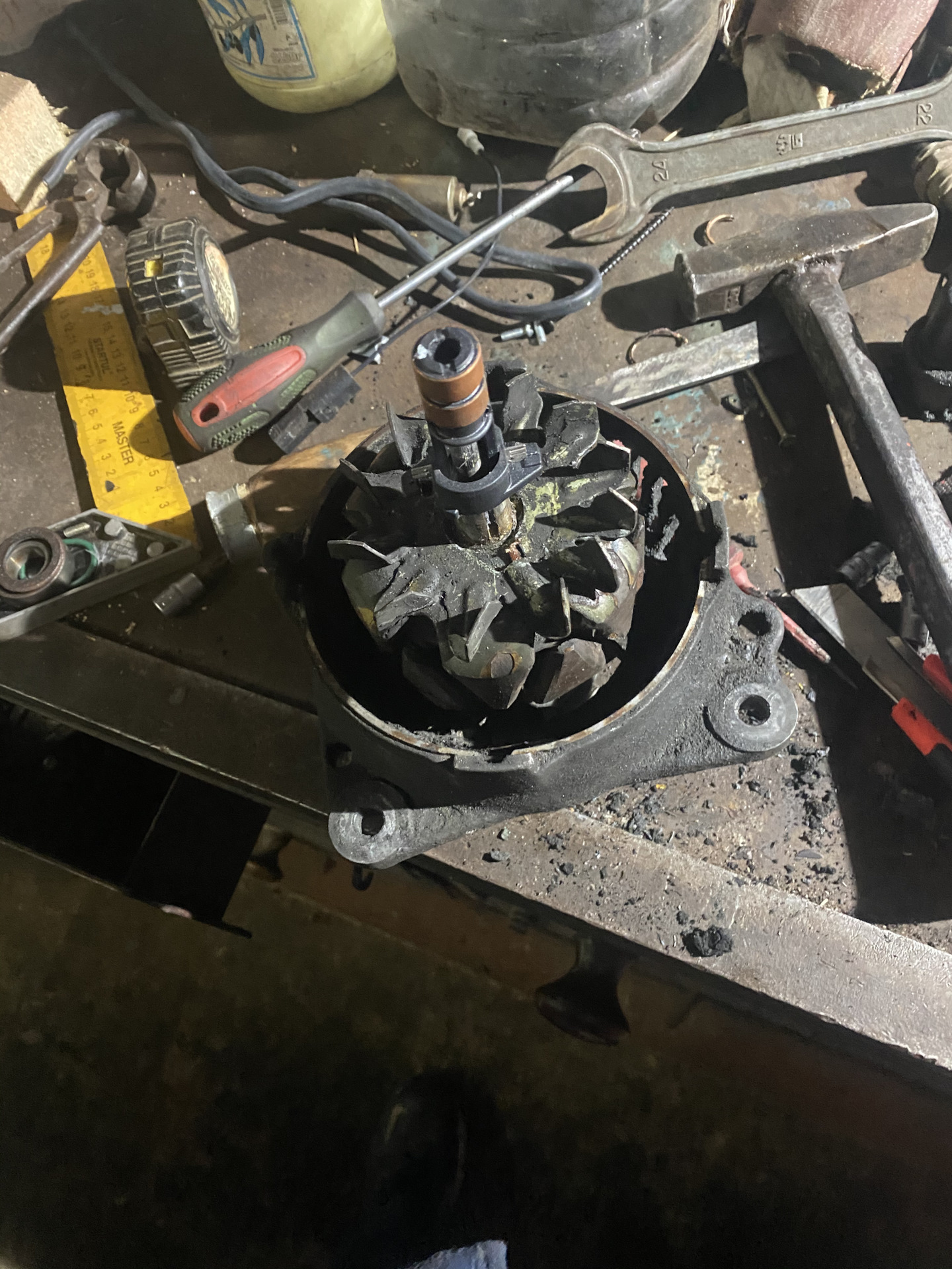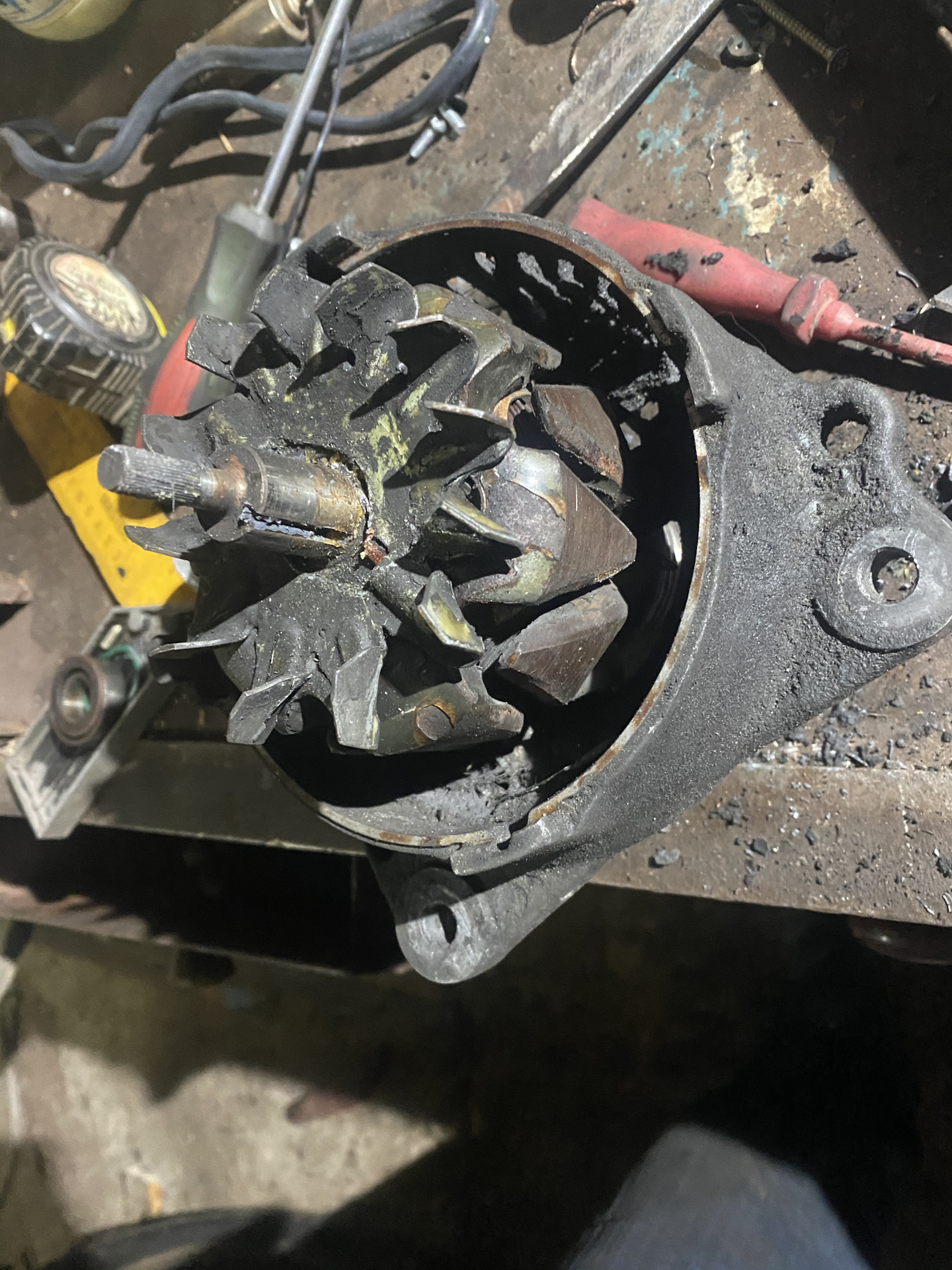 Большой по желанию, при монтаже/демонтаже уделить внимание крыльчатке может погнуться. После снятия шкива, есть на корпусе два/четыре (немного не припомню, вроде бы четыре) отверстия (они забиты грязью поэтому отверткой надо прочистить) перед тем как открутить болтики и лучше запастись жёлтым сверлом на 4мм, так как болтики под фигурную отвертку(у меня открутился один) просверливаем дырочку в центре, немного что бы иметь возможность забить звездочку, если просверлить много то шляпки могут обломаться. Откручиваем и далее сбиваем верхнюю крышку. Демонтируем/монтируем подшипник(рекомендую иметь съёмник или мини как ее шлифовальную манку Толи болгарку, я думаю поймёте о чем я) снять проблемно, спилить проще. Я отмучал болгаркой.