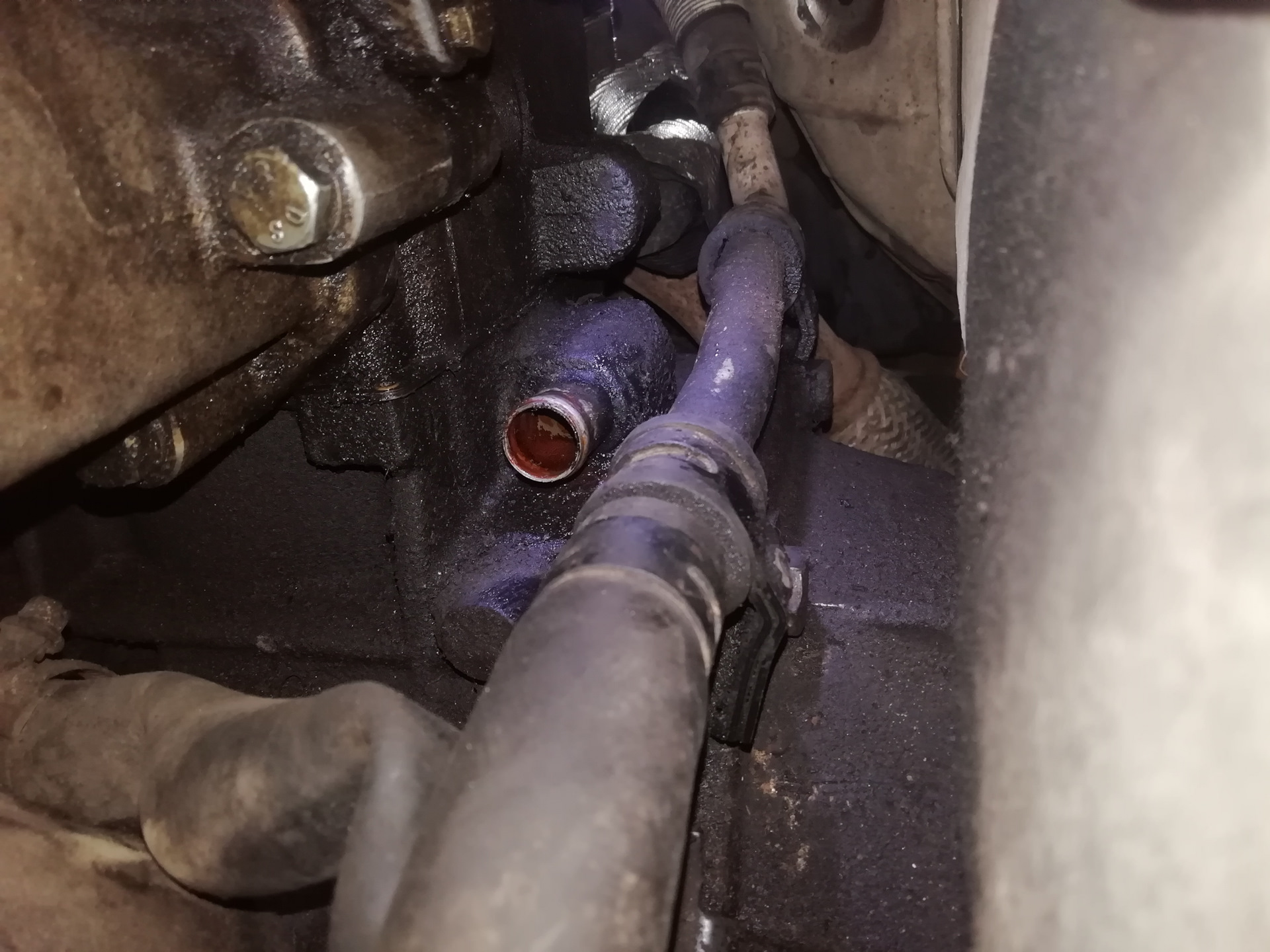 Говорю вертать всё на место и я поехал. Посмотрели на меня как на дурака, но надо отдать должное, показали откуда течёт и сказали хрен без съёма кпп чего сделаешь. Но тут дело ещё в том, что коробку позже и так хотел снимать. Хотел починить кулису, которая прилично разболталась, и ещё одну запчасть заменить, но об этом позже. Делать нечего, лечу в гараж. Открутил защиту, коробка вся в антифризе. Снизу определить утечку не смог. Полез смотреть сверху. Морду туда засунуть чтобы что то увидеть не реально. Засунул телефон всё сфоткал и уже по фоткам понял что и как.