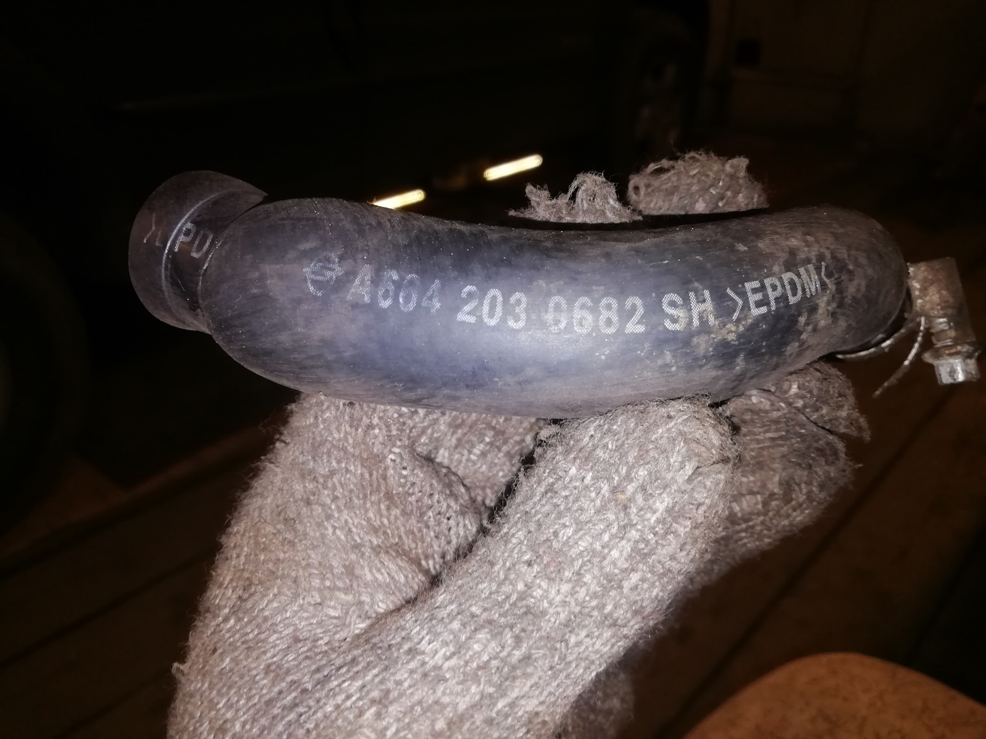 Время уже часов около 10 вечера, родной патрубок в это время найти не реально. Лечу с друганом в ближайший круглосуточный магаз запчастей, прихватив с собой этого обоссанца. Покупаю простой прямой шланг, подходящий по диаметру и на всякий случай похожий угловой от каких то жигулей. Понимаю что прямой не подойдёт, слишком большой угол — переламывается. Угловой как раз, но чуть длиньше. Укоротил и давай его устанавливать. Самым проблемным оказалось натянуть его на ответные трубки. Шланг новый, толком зацепиться рука не лезет. Но мне удалось.