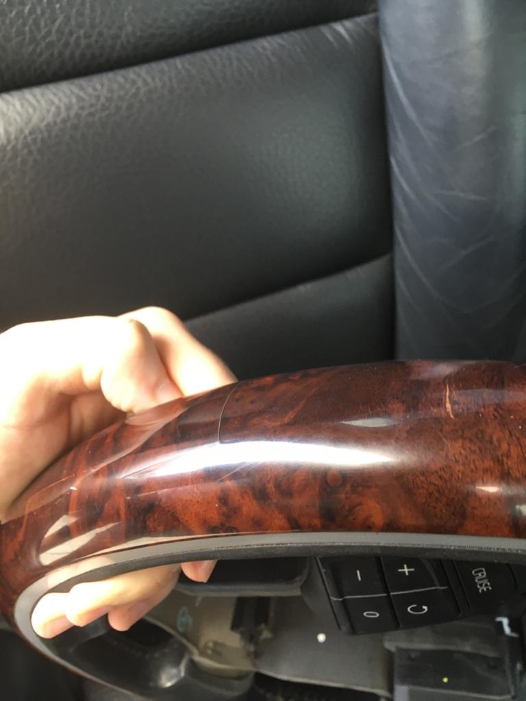 Первым кто приступил к его реставрации, был мужичок, спец по дереву, он мне уже один раз помог восстановить табуретку в форме животного, получилось лучше, чем оригинал. Согласился сделать и руль, но процесс не быстрый, так как своя специфика работы с деревом и лаком, которым покрываешь. Убрал трещины на руле, также на фото видно, что обод серого цвета, выполняющий роль замка для кожи, который между деревянной частью руля и кожаной, был в трещинах, а при снятии их добавилось. Обод тоже восстановлен и покрашен в цвет. Кстати ребятам, которые занимаются аквапринтом, сделать такой обод не по зубам, проверено .Обод приклеен на какой-то клей-герметик, потому что сидит как-то не совсем жестко, но плотно. Около 10-12 дней занял процесс восстановления деревянной составляющей, вот почему подменный руль выручал, а так машина стояла на приколе.
