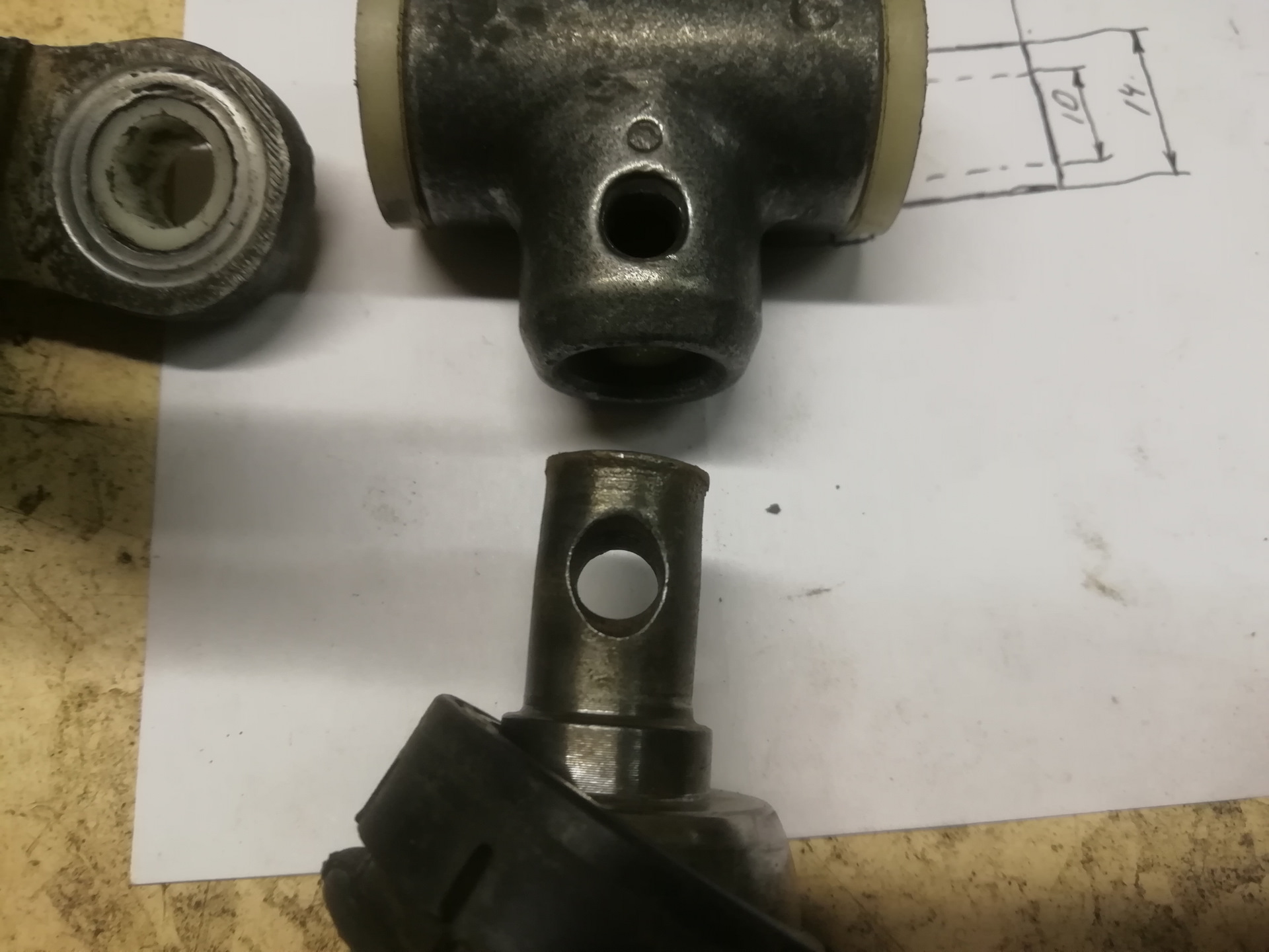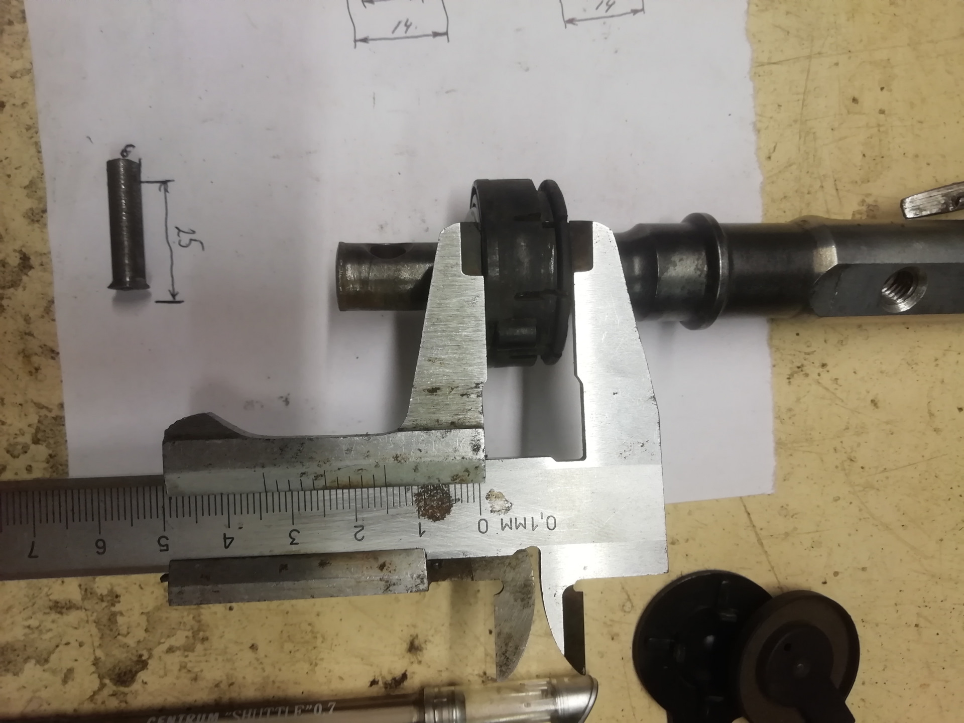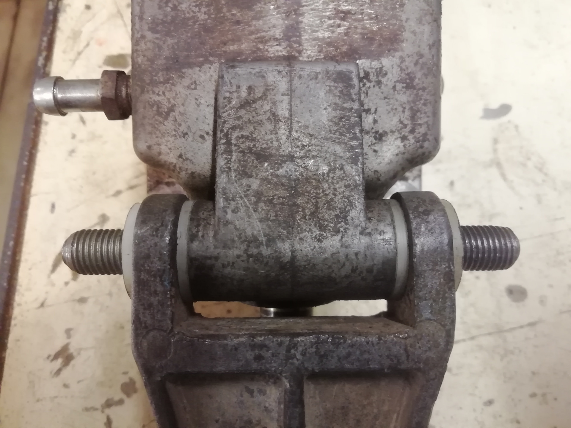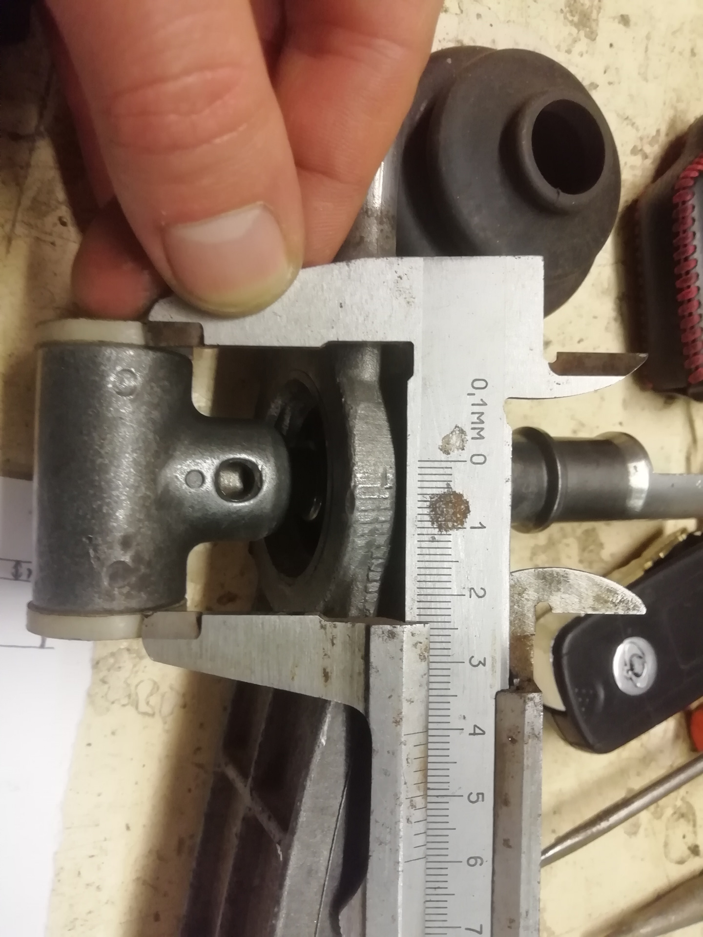 В общем 99% люфта было тут. Ни чего умнее не придумал, как расплющить нижнюю часть молотком (на фото видно) В итоге добился довольно тугой посадки. За одно заменил все втулки на фторопласт. Как смог снял размеры (не судите строго, может кому сгодится). Дальше фотки, думаю понятно всё будет: