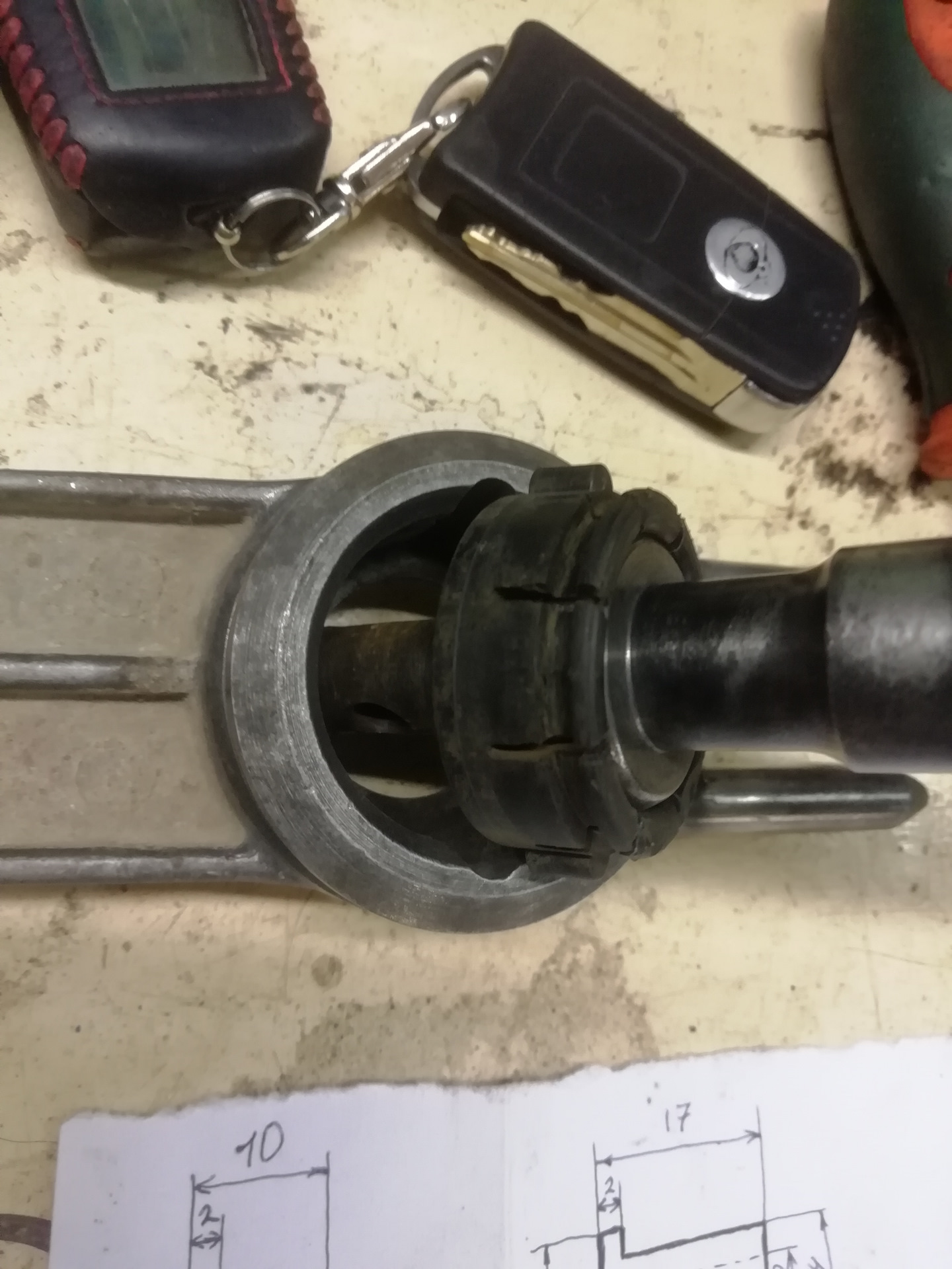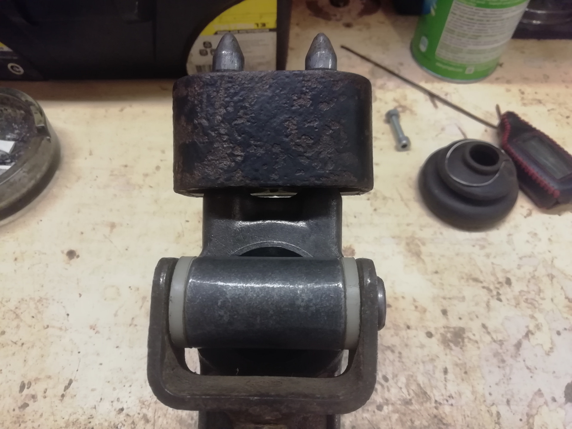 Давненько меня раздражало, что рычаг кпп имеет свободный ход (лево-право) около 5-6см! Причём вперёд — назад ни какого люфта нет. Самому в одно лицо снимать коробку не хотелось, тяжёлая зараза. Поехал в сервис, ну как сервис. Частный дом, при нём гараж. Друган у меня там обслуживается. Договорился. Кулиса у меня ещё одна есть вместе с мкпп. В своё время (когда был мал и глуп) приобрёл за недорого. Ребята в соседнем гараже перевёртыша разбирали. Не нравилось мне в своей плохое включение 1 и 2 передач. С форда фокуса на кайрон когда пересел, думал в коробасе дело. В общем купил и поменял свою на донорскую. Разницы особой не заметил, ну вроде чуть лучше, но в общем одно и тоже. Знать бы мне тогда что это не поломка, а конструктивная особенность этого динозавра. Вот и лежит родная в гараже. Донорская была с кулисой. ( Я скоро второго кайрона смогу собрать :) Снял кулису, разобрал и поехал к токарю. Изначально думал дело во втулках, но не тут то было. Втулки оказали ещё ничего, но раз уж мы у токаря, то делаем новое всё по максимуму. В общем дело было в месте соединения вот этих двух железок