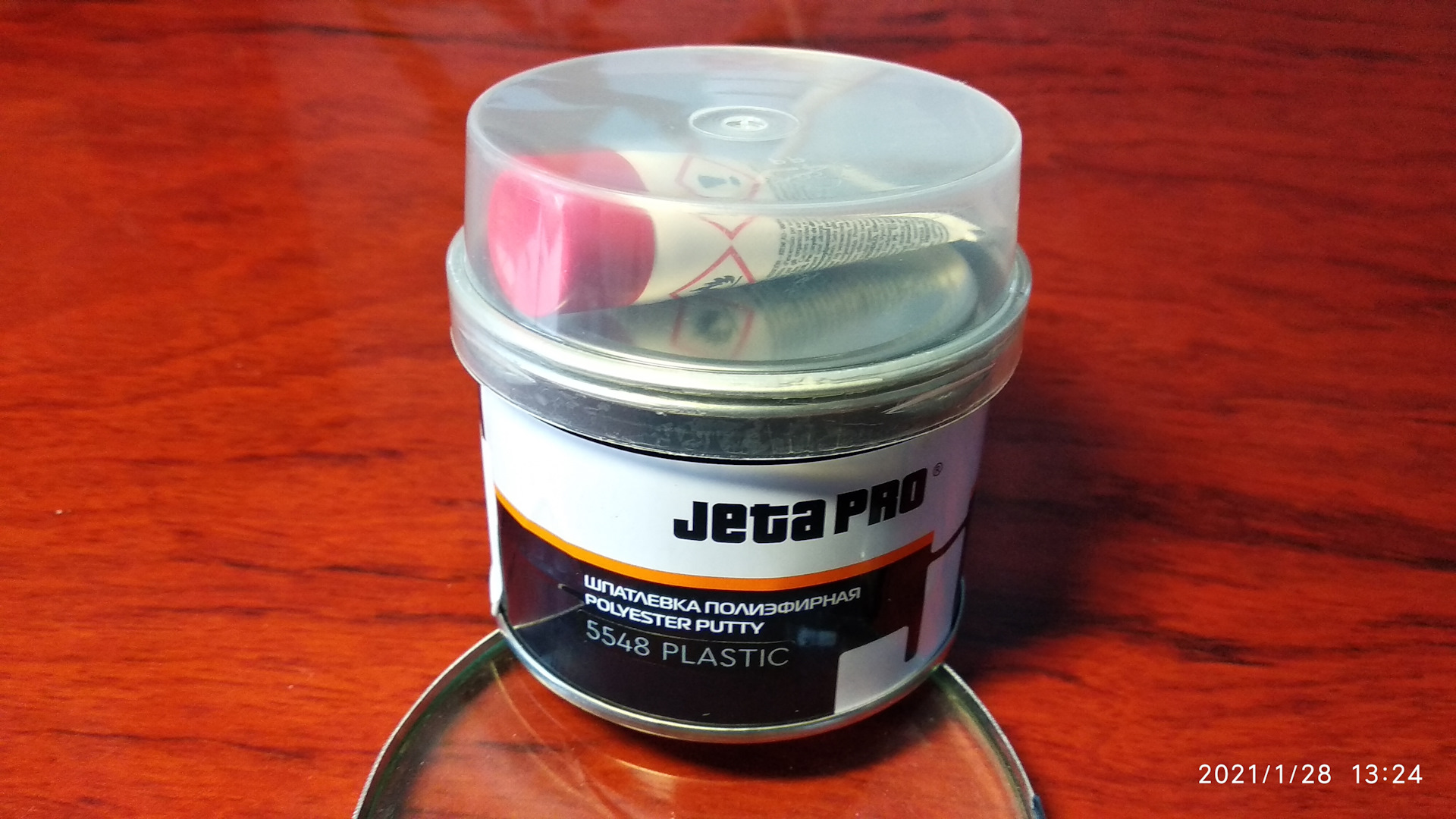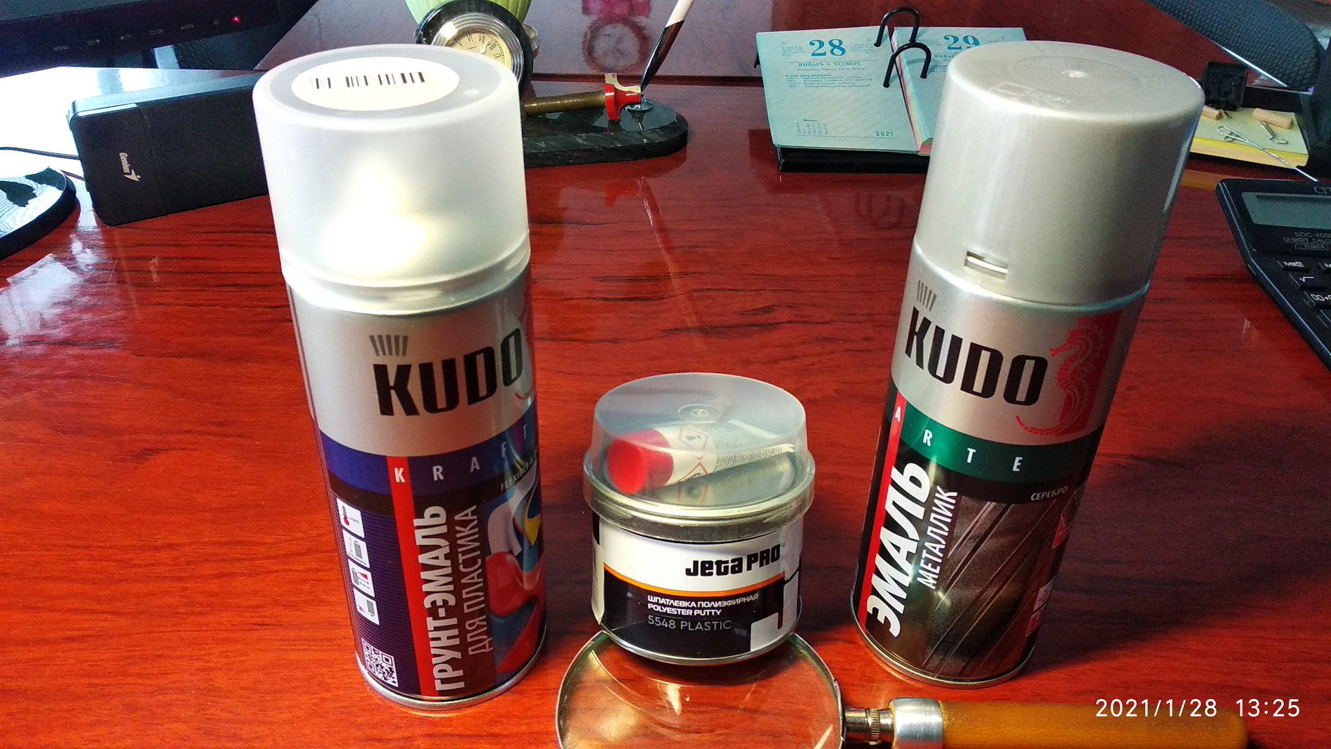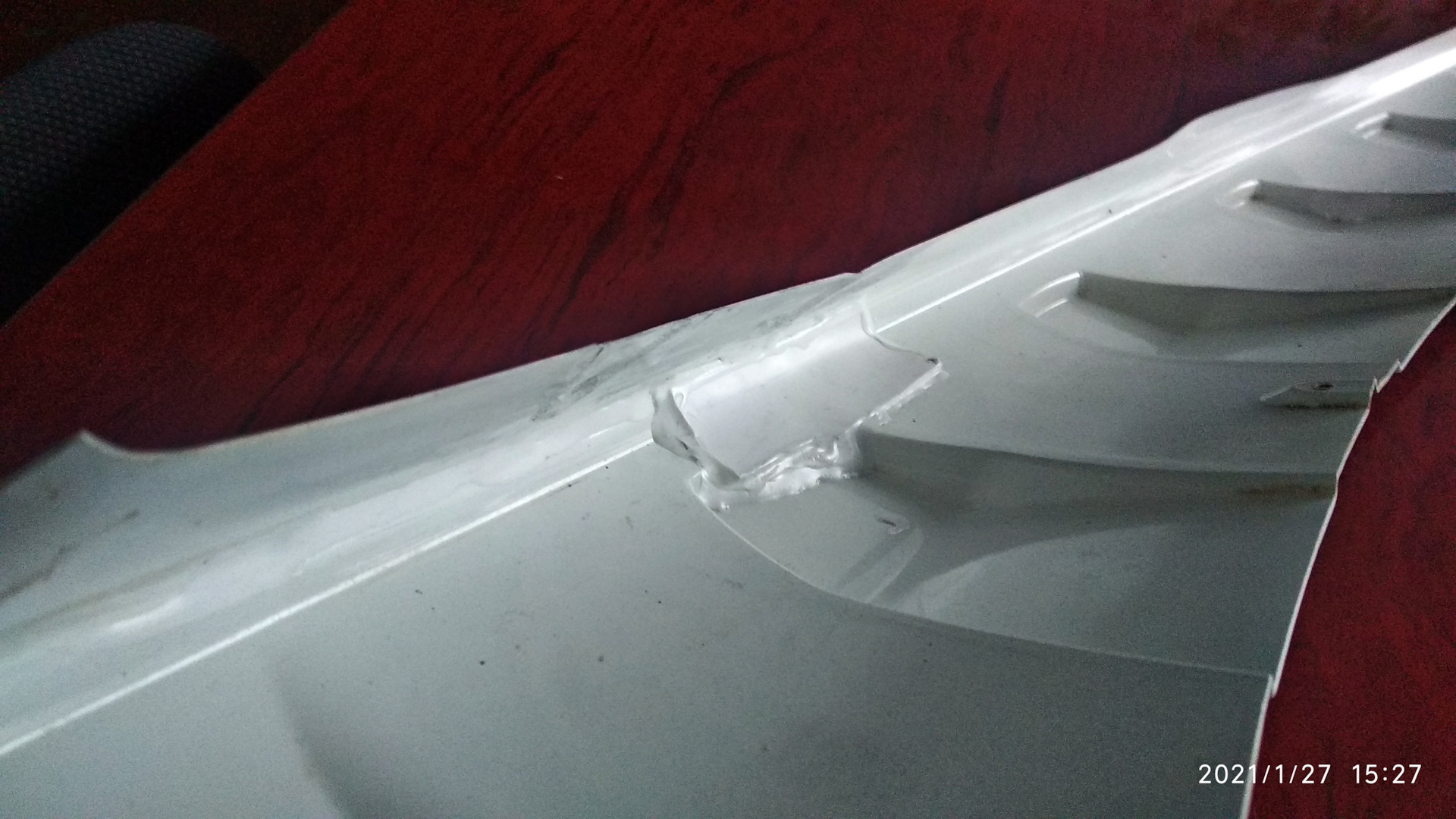 Привет всем посетившим мою страничку . Сегодня я хочу рассказать какая неприятность случилась у меня с передней накладкой бампера . Едем мы с супругой с дачи по трассе и слышим такой характерный удар, как палкой по бамперу, ну думаю ни чего страшного, а по приезду домой решил посмотреть, что это было . Смотрю на бампер, а передняя накладка пробита на сквозь . Расстроился я конечно, ну думаю ладно куплю новую, а не тут то было — ни где нет . Помню даже Алексей grazier1979, наверное один из последних, такую покупал . Посмотрел там где он брал www.zzap.ru/, нет в наличии. Можно конечно было на этом и закончить, но я так просто не сдаюсь . Решил буду ремонтировать . Фото разбитой накладки к сожалению не сделал, но как ремонтировал есть . Для ремонта приобрёл : клей, шпаклёвку, грунт и краску, ну и набор шлиф шкурок .