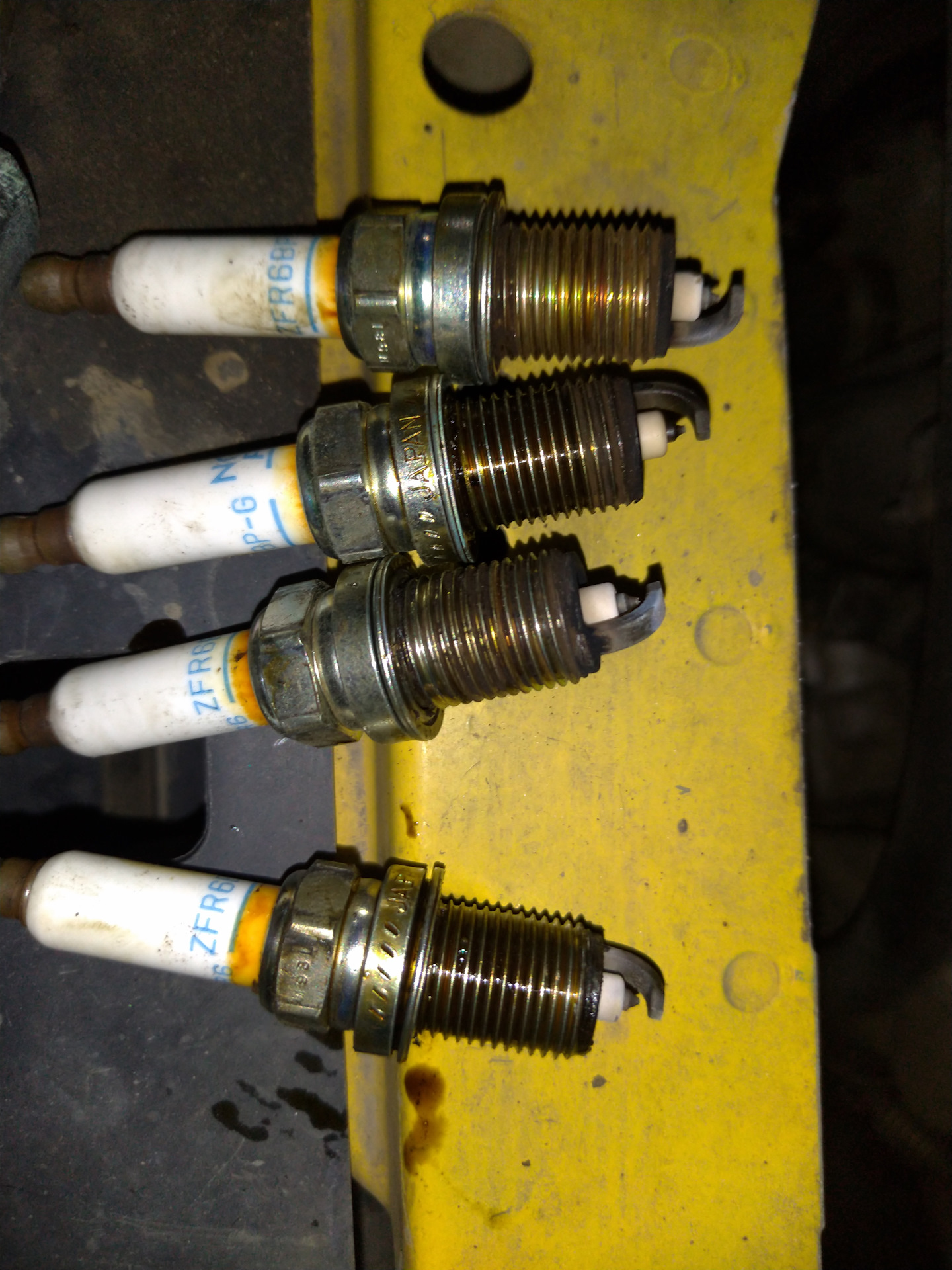 По приезду на работу продиагностировал OBDшкой, которая показала ошибку P0301 (пропуск зажигания в первом цилиндре). Естественно после сброса ошибка появлялась опять. С работы ехал не спеша, так как только даёшь газу машина дёргается. Дома выкрутил свечи. Правда я их менял всего 10000 назад. По мне выглядят не очень.