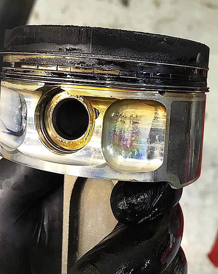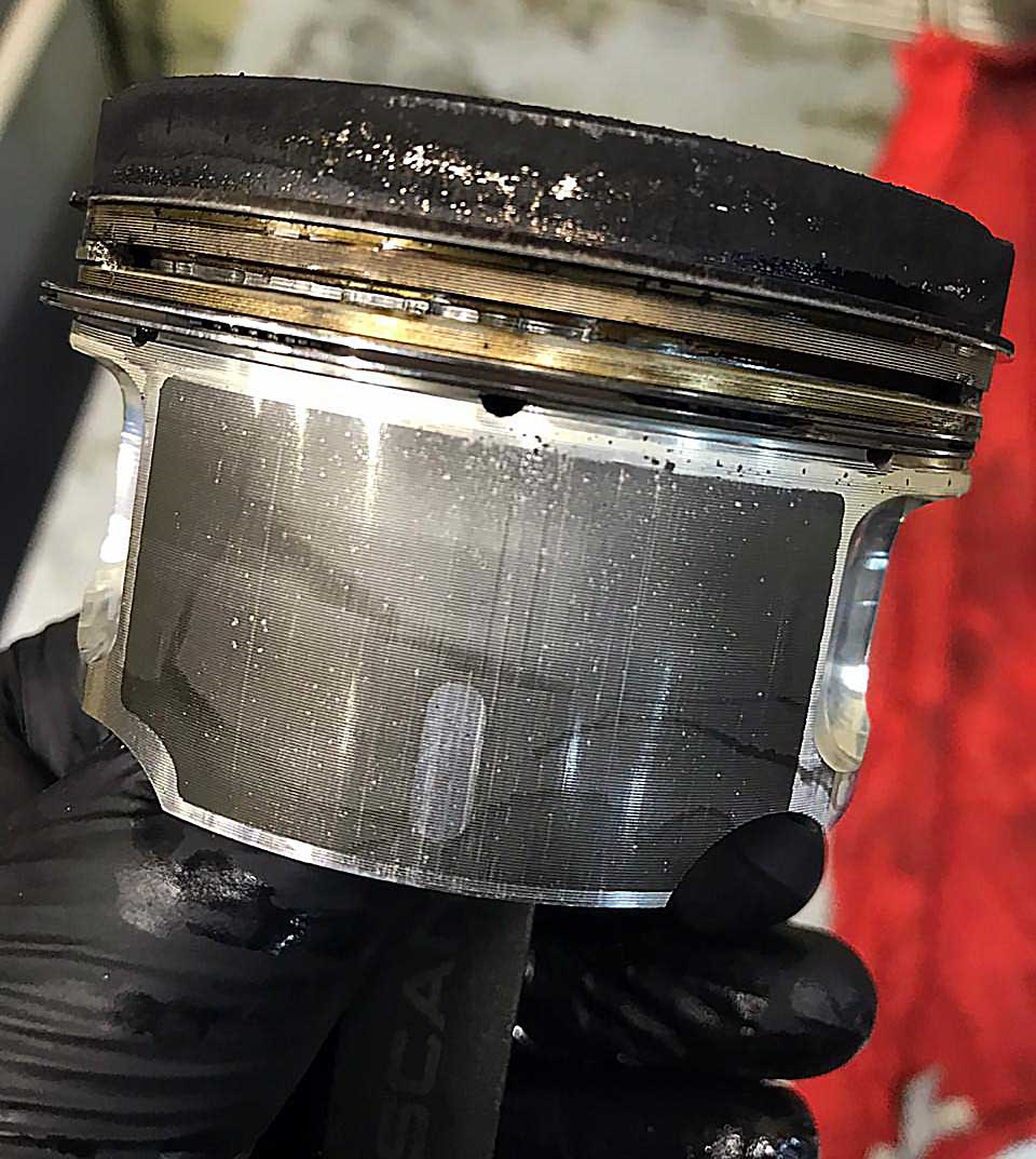 Но т.к. в тот момент я уже знал о том, что у нескольких человек посыпались поршни СТИ, поэтому раз уж все равно приехал, решили глянуть цилиндры эндоскопом. И в 3-м цилиндре обнаружили маленькую, но очень заметную грустную лужу масла на поршне. Сделали лик-тест и на 3-м цилиндре я услышал бульканье из масляного щупа… Приехали, одинаковая беда поршней СТИ меня не обошла, зажало кольца.