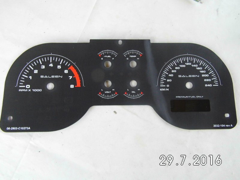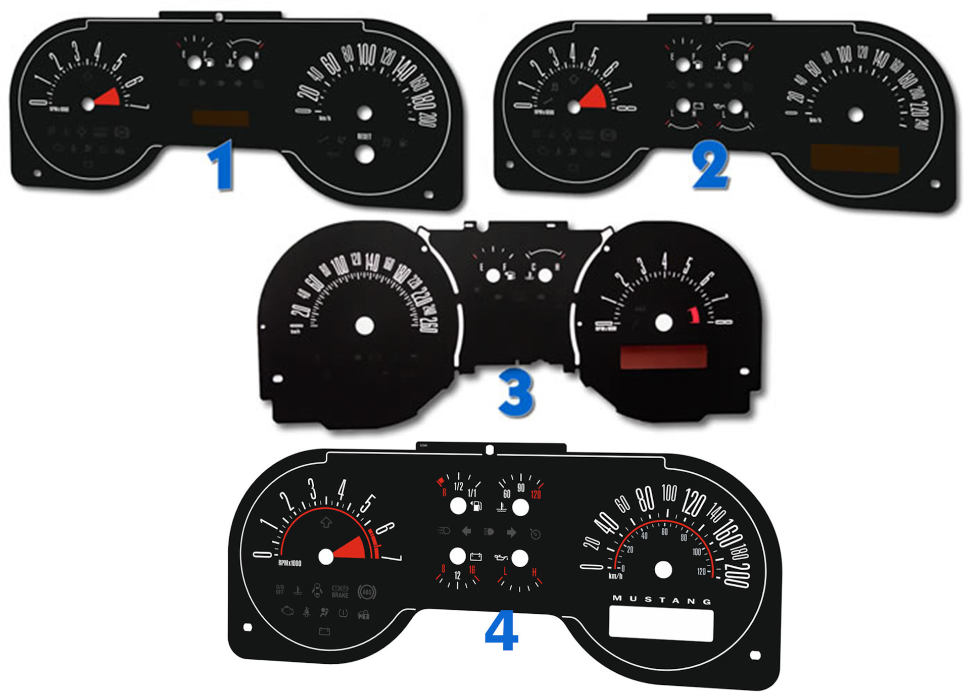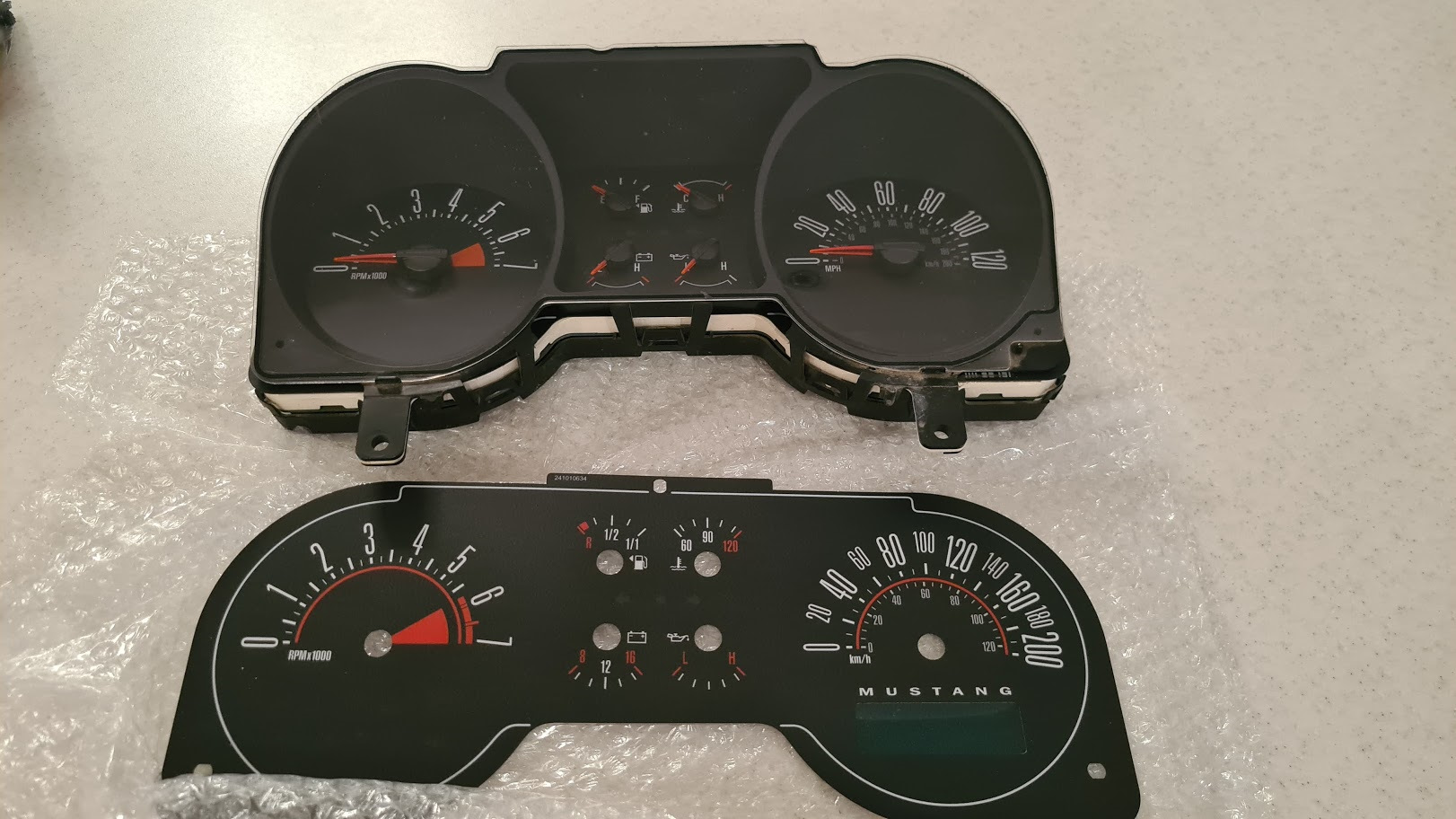 Решил доапгрейдить её до 4х стрелочного варианта + бортовой комп. Ко всему прочему на мусте, в отличие от камаро не переключается мили на км на спидометре. Решение в замене шкал.
