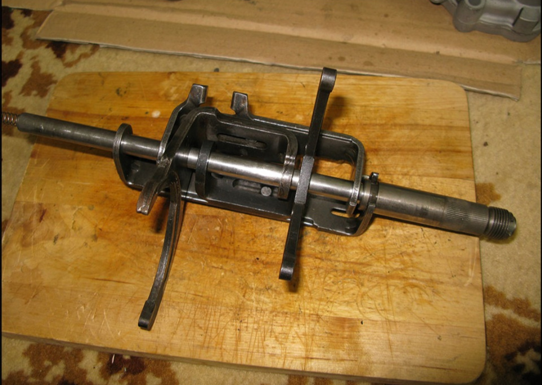 Теперь можно открутить болты крепления двух половин картера, откручиваем, снимаем половинку, так же как и самая верхняя сидит на герметосе и двух направляющих, и только теперь можно чуть приподнять шток обоймы на которой держутся вилки и движением назад вытащить весь механизм целиком, снимается просто.