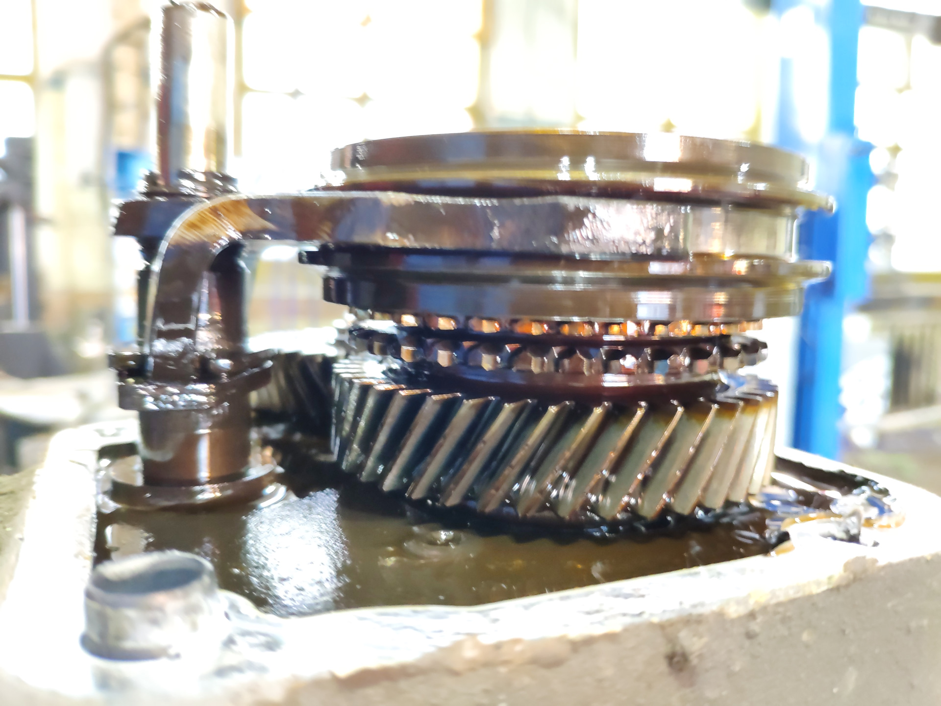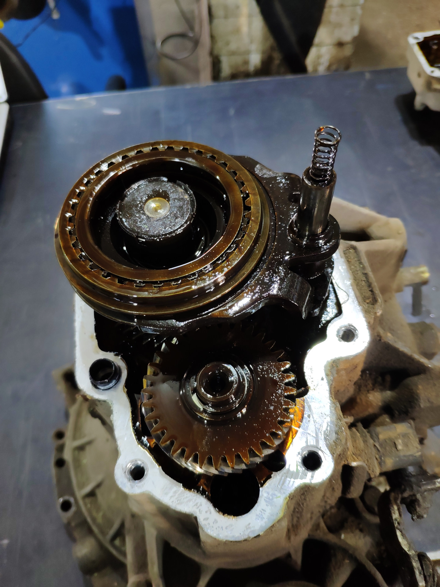 Затем откручиваем два болта крепления механизма включения/выключения задней передачи, вынимаем. Затем нужно снять вторичный вал, выходит без проблем только нужно снять сначала стопорное кольцо 4 передачи на первичном валу и вместе с шестерней 4-ой передачи первичного вала вынимать вторичный. После убираем шестерню задней передачи, она снизу одна не ошибётесь. Снимаем стопора, шестерню 3-ей передачи и упрёмся в то что 1 и 2 передачи плотно сидят, тут мне помогли две монтировки т.к мой съёмник оказался мал, аккуратно поддеваем с самого низу шестерню и давим, у меня вышел не с первого раза. Откручиваем 4 болта крепления самого вала к корпусу, а после можно и диф вынуть. Разобрав коробку меня особо сильно не интересовало как шестерни, синхроны, подшипники, ведь ничего не гудело, звуков никаких с КПП не было, и включение непосредственно передач было без хрустов и чётким не смотря на разваленную кулису, Но на всякий то что можно было я осмотрел разбирая по минимуму, но отмывая хорошо.
