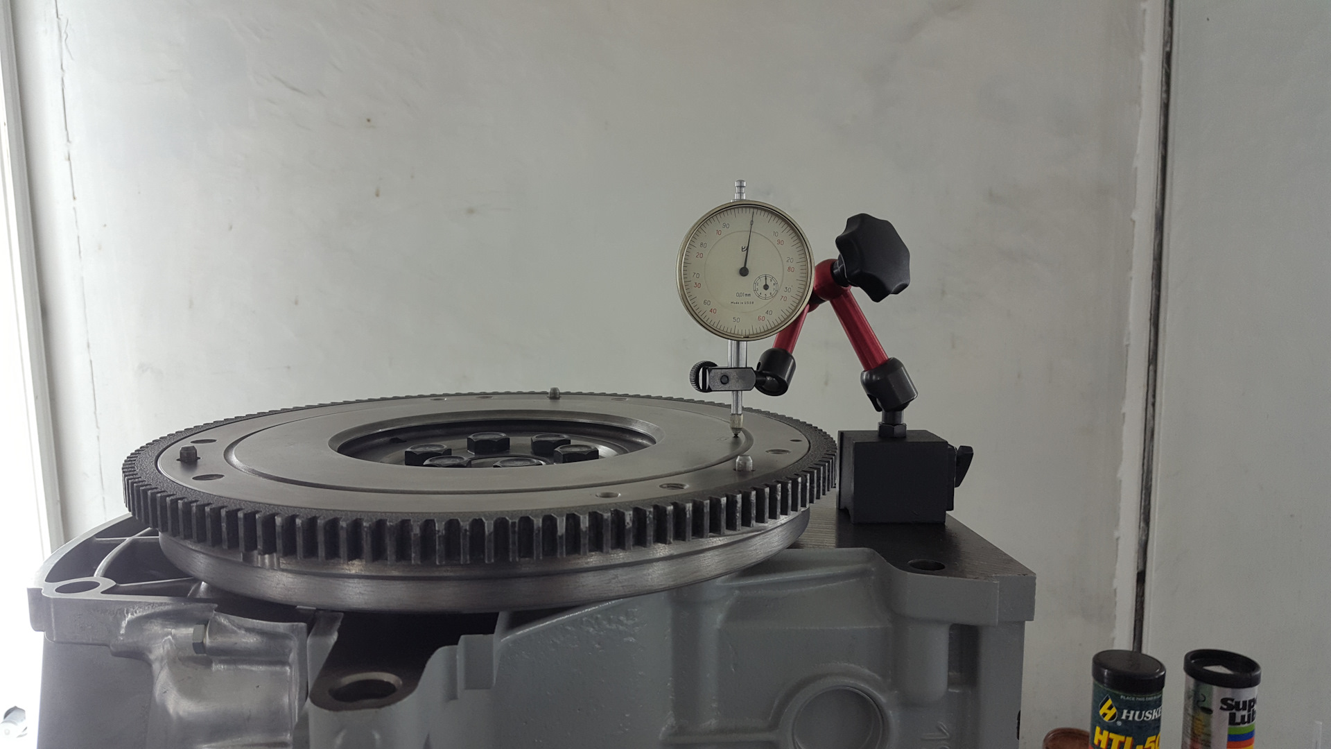После затяжки болтов, я решил проверить биение маховика, установив магнитную стойку с индикатором часового типа.