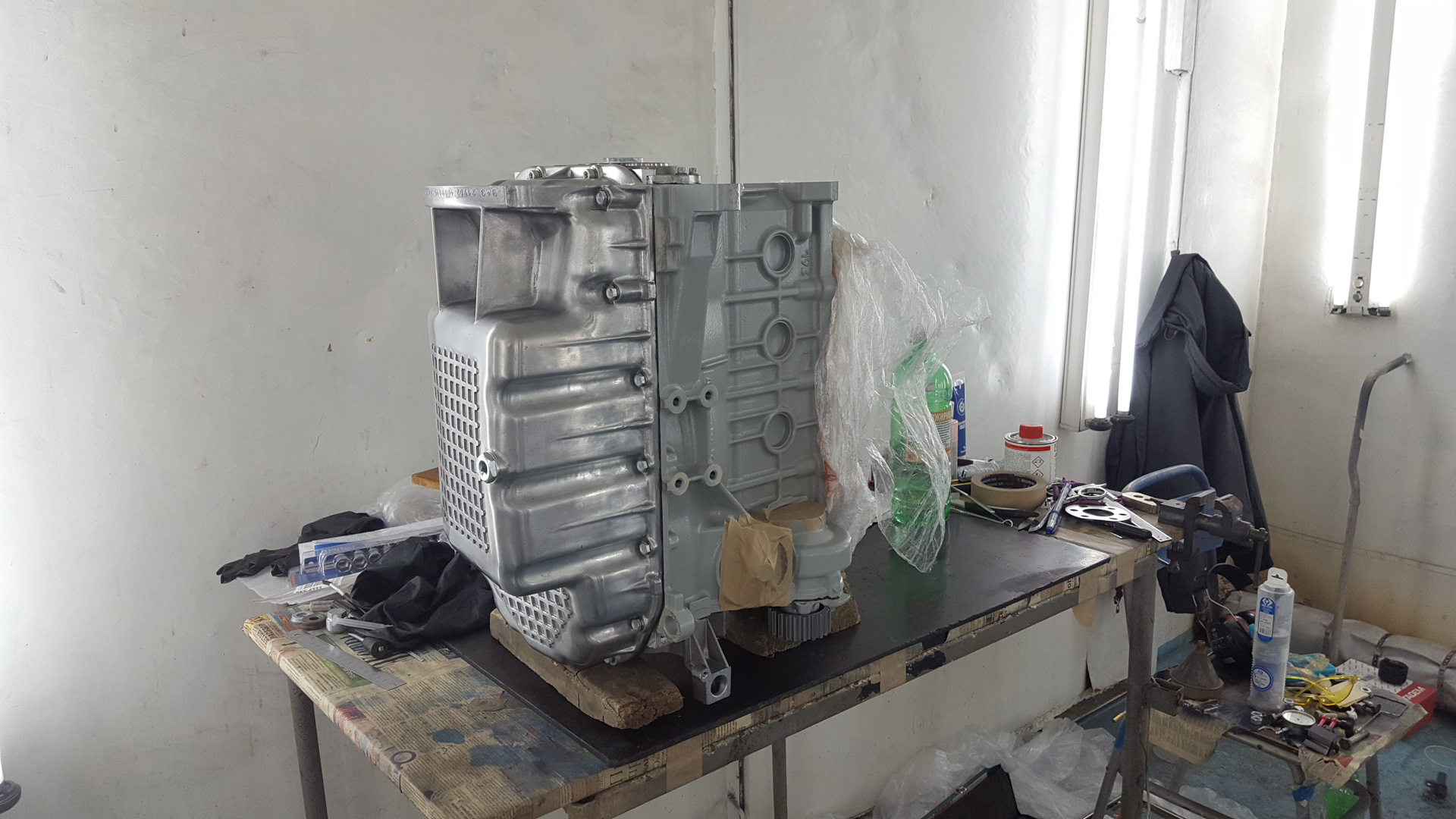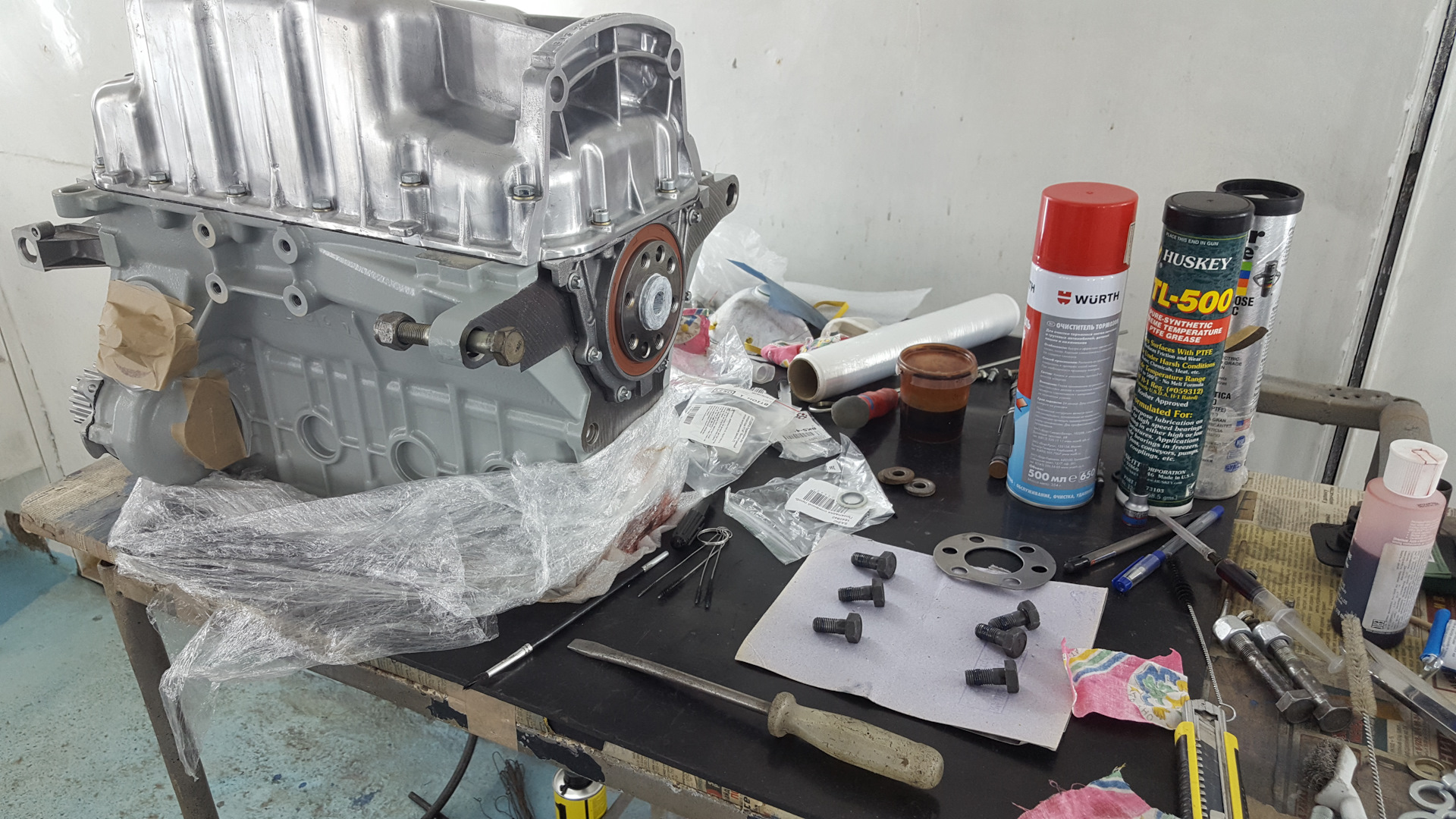 Этот двигатель прошёл всего около 2-х тыс., когда я его приобрёл, и он ранее не разбирался, — стояла заводская пломба на кожухе ГРМ. И когда я откручивал маховик, то болты были посажены именно на синий анаэробный герметик. Двигатель 2016 года был.