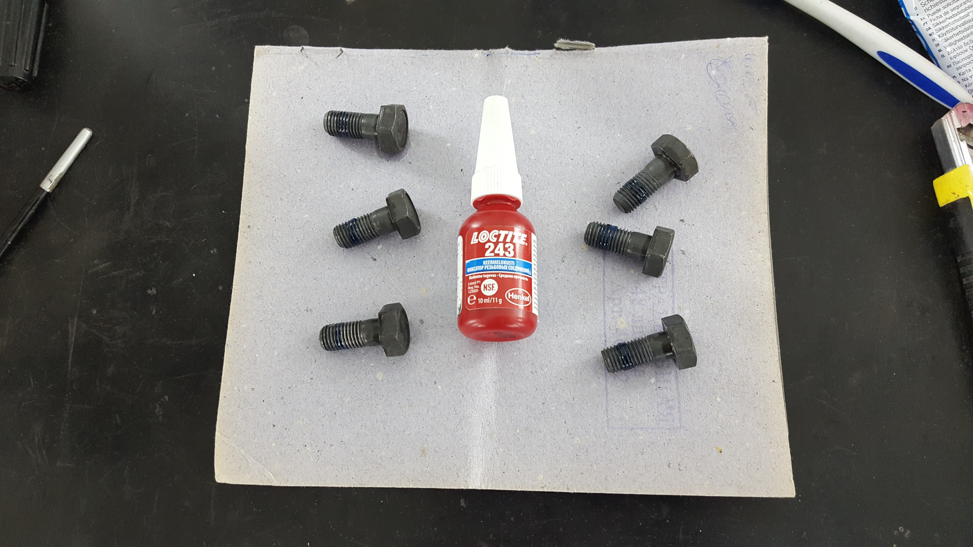 Болты крепления маховика с завода были посажены на синий фиксатор резьбы. Его, из пазов между витками резьбы, вычищал тонким шилом, а затем щёткой по металлу. Должен отметить, что фиксатор держится достаточно хорошо, и пришлось потратить не малое количество времени на очистку болтов. После этого болты обезжирил, обдул сжатым воздухом и нанёс фиксатор резьбы Loctite 243 — арт. 1918987.