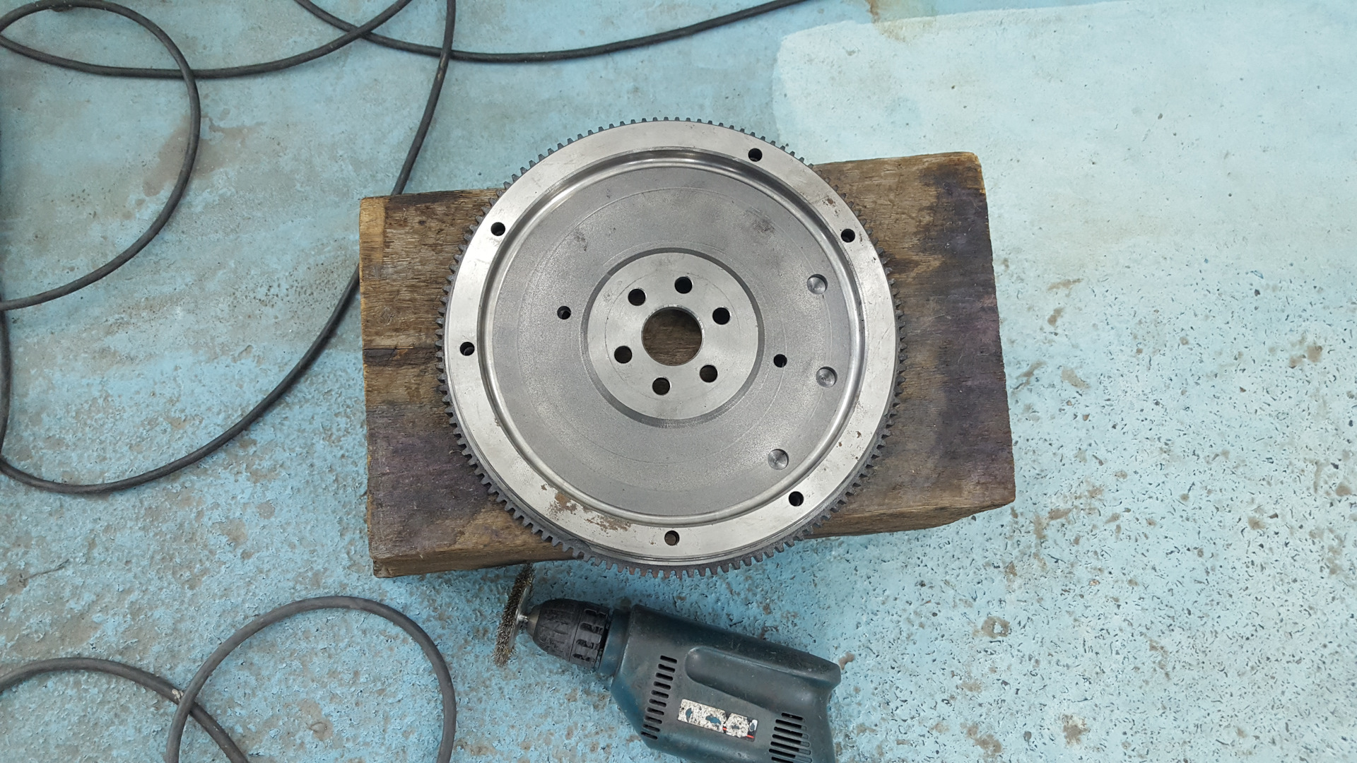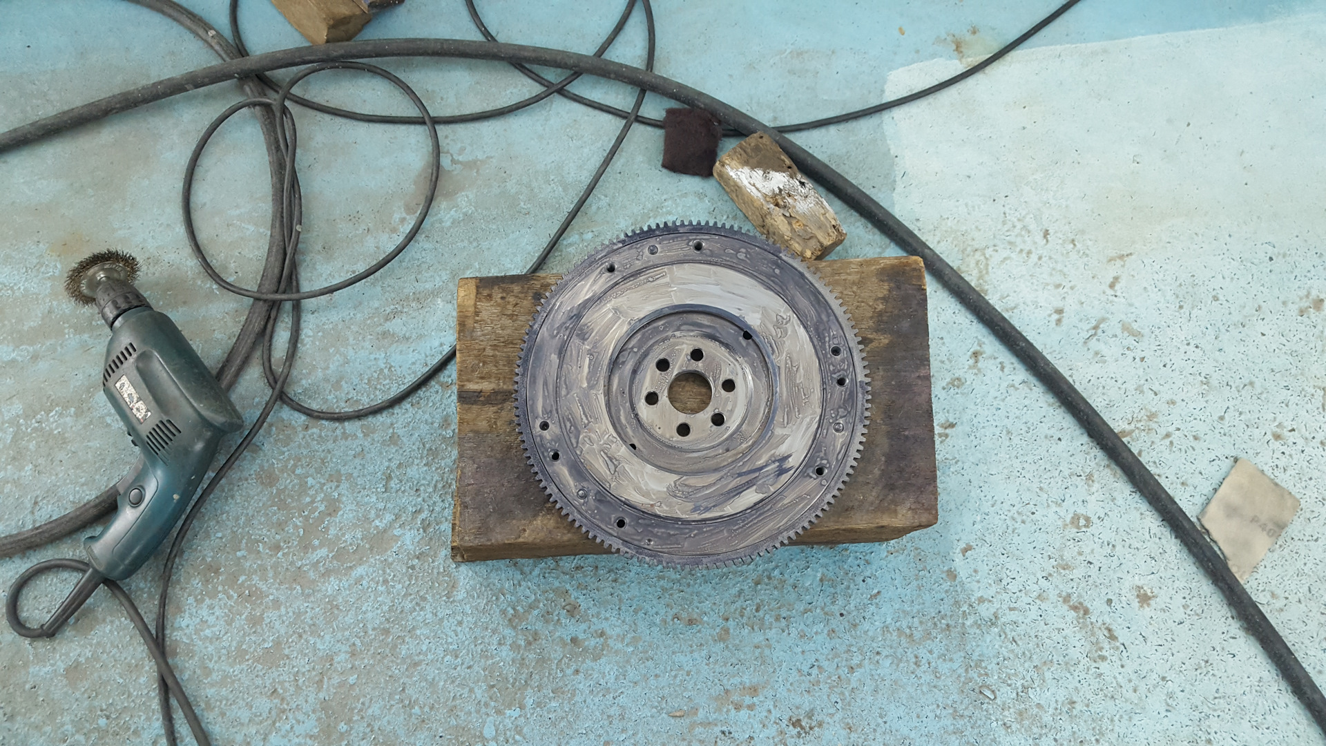 Зачистил маховик металлической щёткой с помощью дрели.
