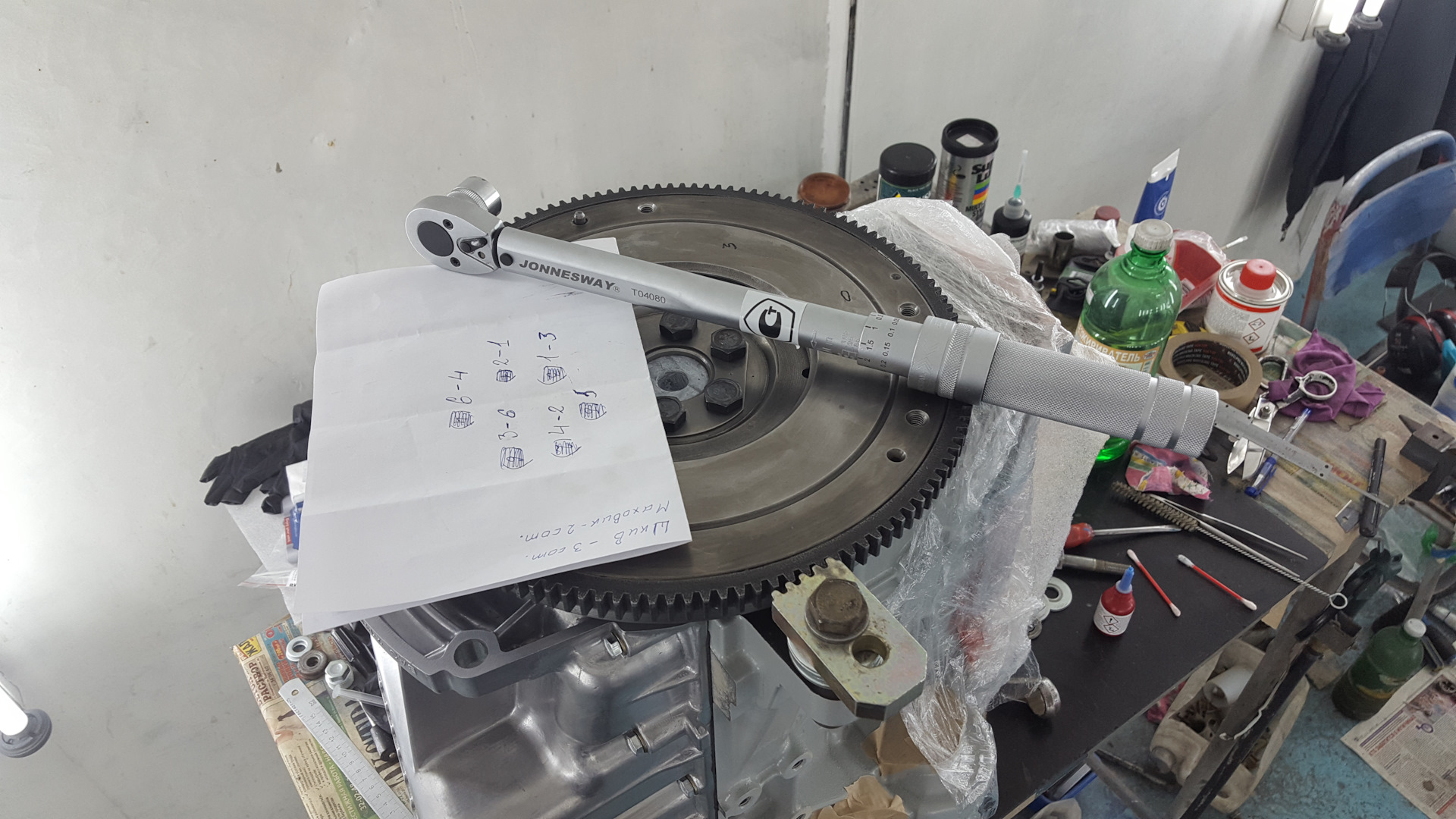 Установив маховик и наживив болты, я озадачил брата, чтобы он придержал блок и стопорящую маховик монтировку, пока я буду затягивать болты нужным моментом. В итоге, вроде всё получилось.
