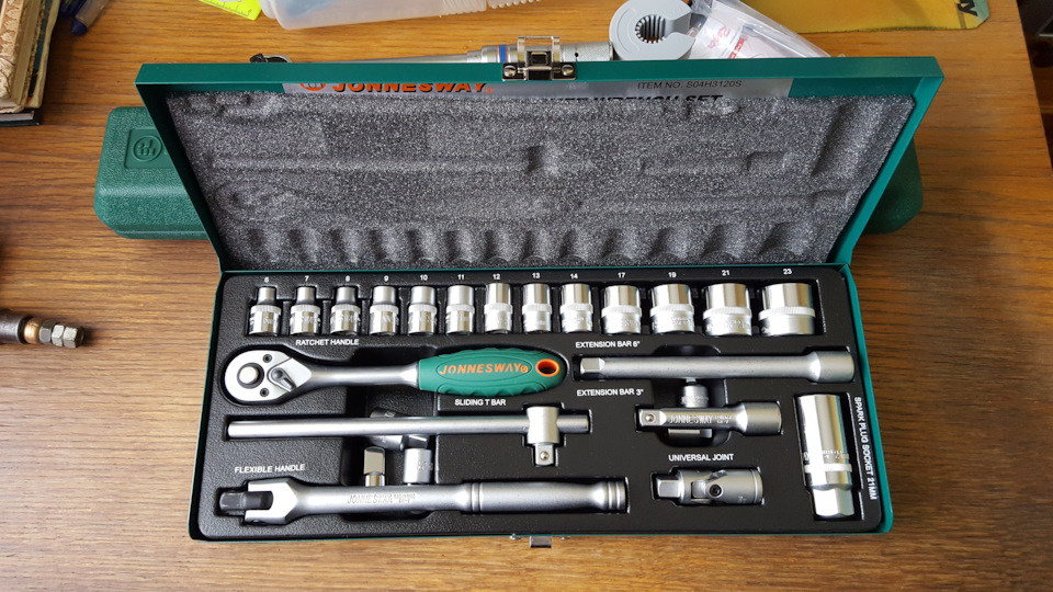 Эти ключи под квадрат 3/8. Для них отдельно покупать головки не стал, а приобрёл набор Jonnesway S04H3120S. Этот квадрат универсальный, можно и маленький крепёж крутить и большой, головками до 24.