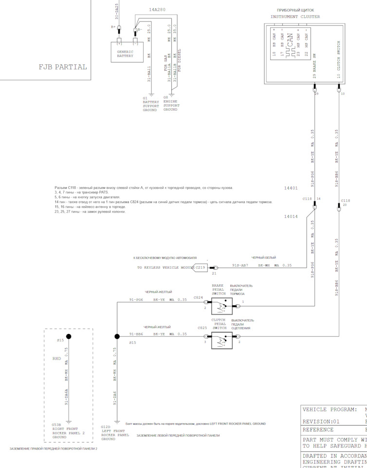 (решено) Ошибка p0571 (чек не горит) на автомобиле фф2 R 2L автомат 2009г. После прозвонки проводки и синей лягушки было обнаружено, что черно-желтый провод был случайно прижат на кузов (На массу) металлической клипсой, которая держит левую обшивку стойки и порога со стороны водительской двери. Выше по проводам от коннектора C118. Неисправность появилась в результате не правильной сборки обшивки стойки и порога левой водительской двери в 2009г. Другими словами прищемили два провода когда собирали автомобиль на заводе. И только сейчас проявилась эта неисправность, когда провод больше вдавился и замкнул на массу. Схему проводки прилагаю: