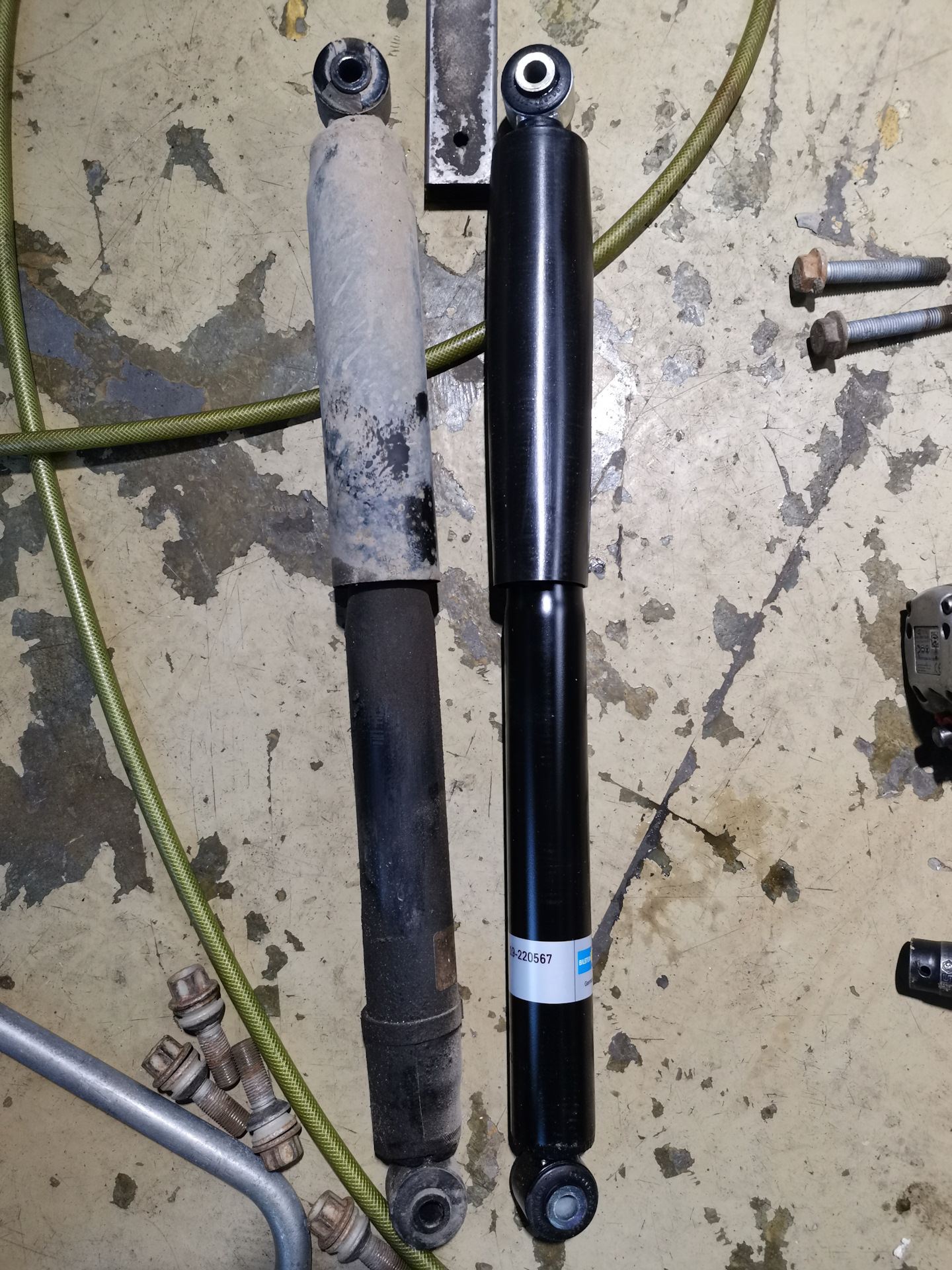 Снимаем колесо и, в принципе, видно все крепежи. Нижняя гайка в прямом доступе, а верхнее крепление достаточно высоко и находится за рамой. Нам понадобится ключ и длинная головка на 18 (!), для верхнего крепления я использовал карданчик и удлинитель. Для срыва верхних гаек, да и для быстрого их откручивания я советую использовать пневмо инструмент, потому как держать болт и одновременно крутить гайку одному нереально, возможно, с ямы это сделать проще. Для замены выбрал амортизаторы bilstein B4 (их уже много кто ставил) На фото ниже видно что они один в один по длине, но по корпусу видно что тоньше и у них пластиковый защитный чехол.
