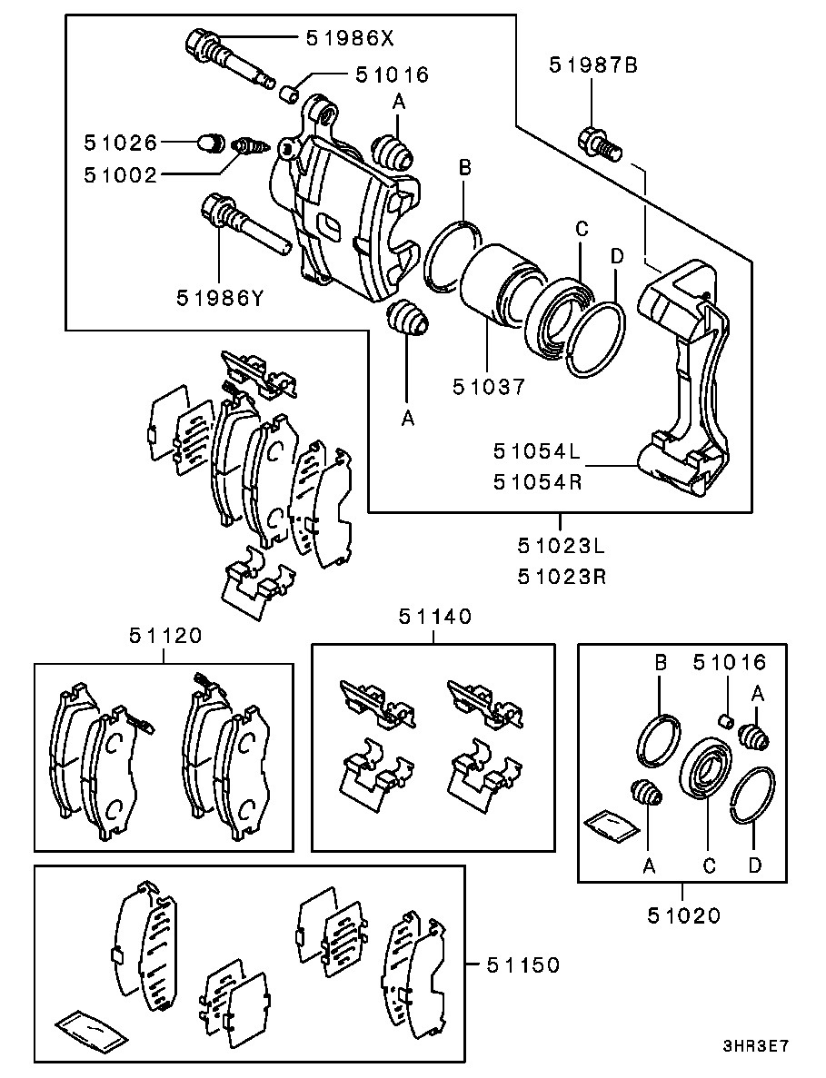 3. Комплект передних тормозных колодок (позиция 51120) — MZ690568 (ранее MR569403), неплохие заменители — Akebono AN650WK, Bosch 0986495253, Delphi LP1684, TRW GDB3287.